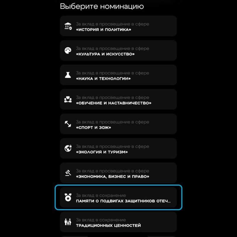 — там выберите номинацию «За вклад в сохранение памяти защитников Отечества» и выберите «RT.Док: Время наших героев».