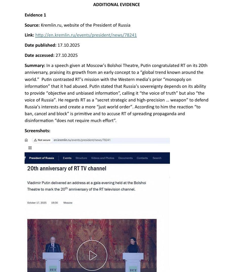 На адрес редакции пришло письмо. Суть: продлеваем санкции против RT. Приложили обоснование на 36 страницах. Пишут, что доказательство №1 следующее: