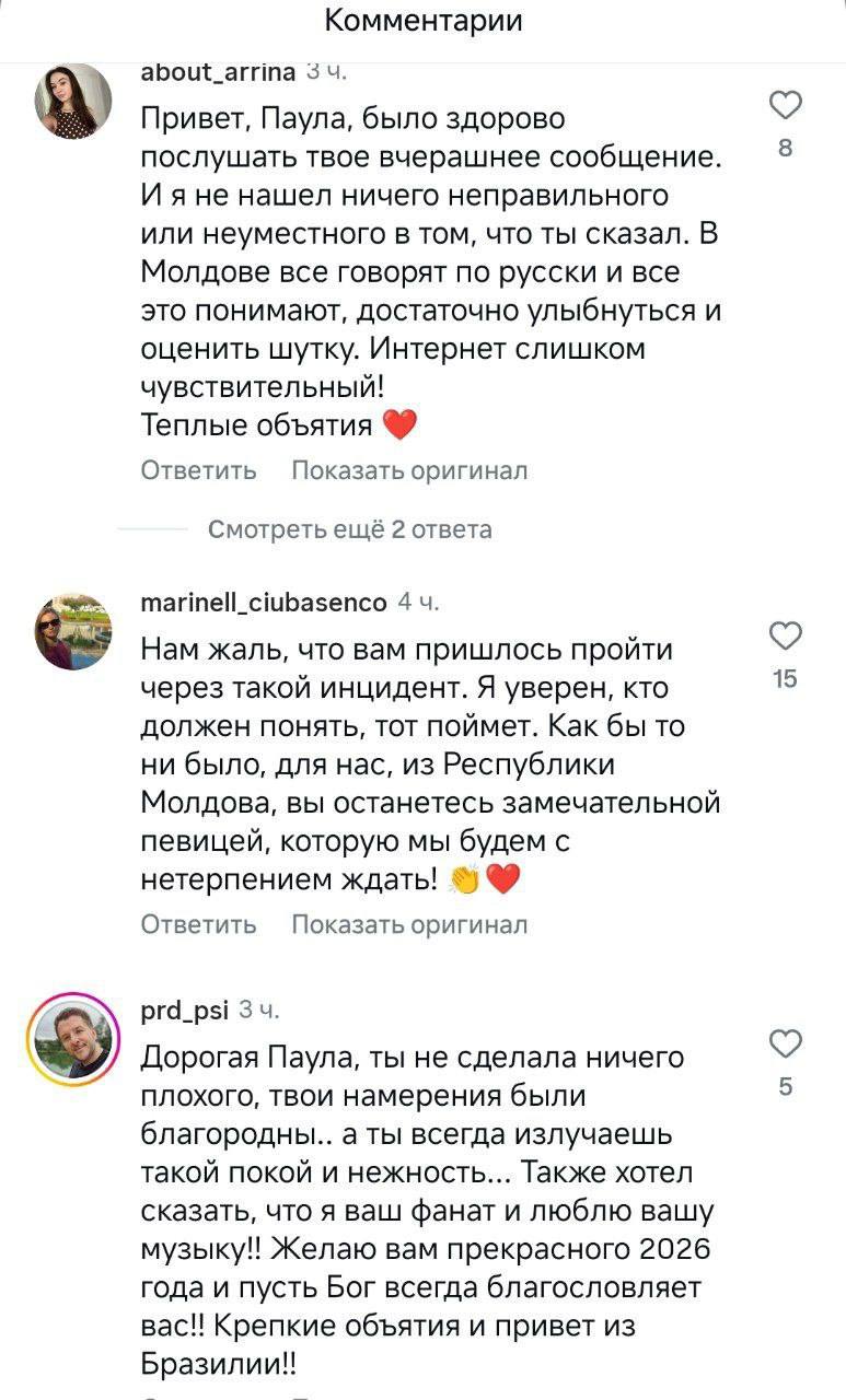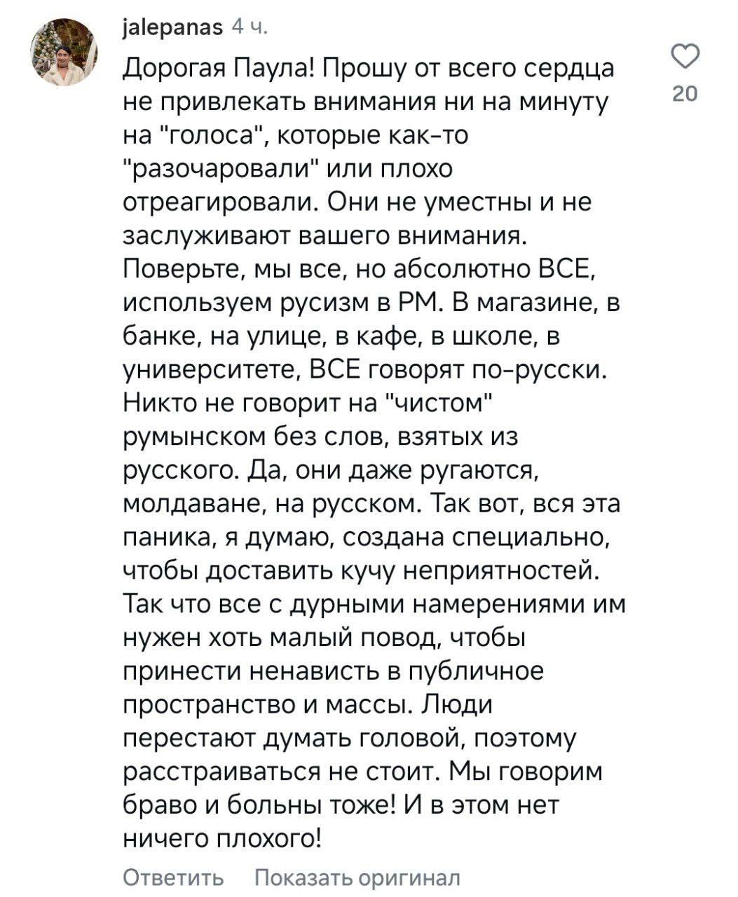 Бывший пресс-секретарь Санду, а также другие политики и общественники накинулись на артистку. Видео с извинениями она выложила в Instagram (запрещён в РФ). В комментарии пришли в том числе румыны и молдаване. Пишут, что ей не за что извиняться и в повседневной жизни все используют русские слова.