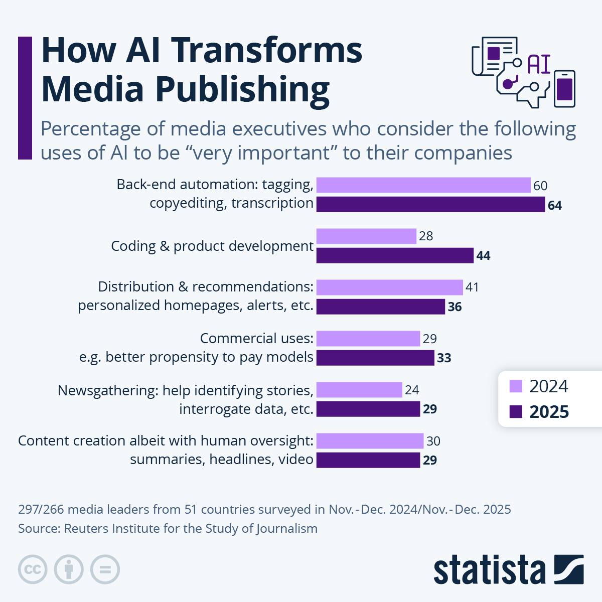 Искусственный интеллект стремительно трансформирует индустрию медиаизданий. При этом автоматизация бэкэнда и программирование — важнейшие области инноваций в этом секторе. Согласно опросу Reuters о тенденциях и прогнозах на 2026 год, в котором приняли участие ~300 руководителей медиакомпаний по всему миру, это 2 самых важных варианта использования ИИ в медиаизданиях в предстоящем году.