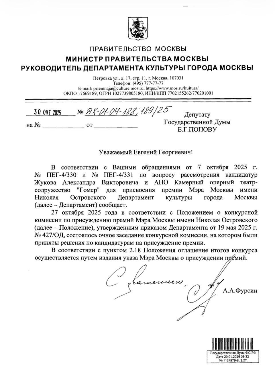 Получил ответ на мой депутатский запрос — театру вручили премию Мэра Москвы имени Николая Островского.