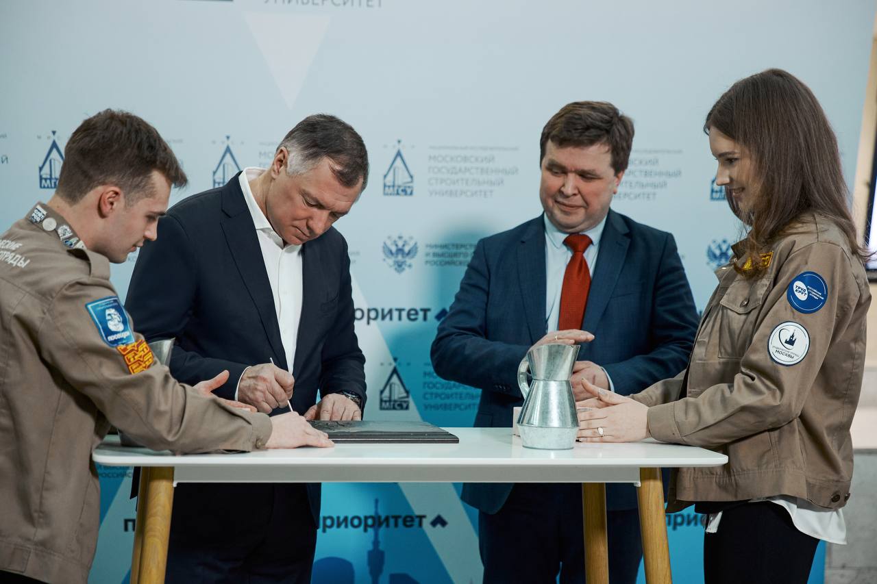 МГСУ как флагман строительного образования играет здесь важную роль. Сегодня мы как раз создали макет кампуса, залив в специальную форму высокопрочный бетон, разработанный учеными МГСУ. Готовая форма будет передана на хранение в Музей МИСИ-МГСУ.