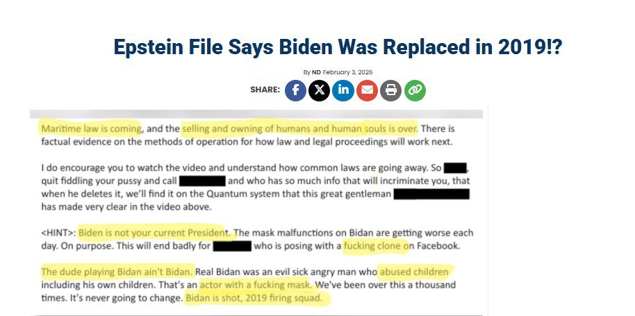 Из файлов по делу Эпштейна: ‘Байдене – не ваш действующий президент. То, что у Байдена маска с каждым днем становится заметнее. Настоящий Байден был злым, больным и агрессивным человеком, который издевался над детьми, включая собственных. Это актёр в маске. Мы проходили это тысячу раз. Это никогда не изменится. Байден был расстрелян в 2019 году’.