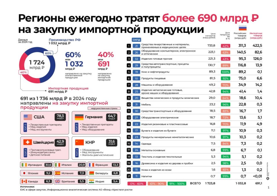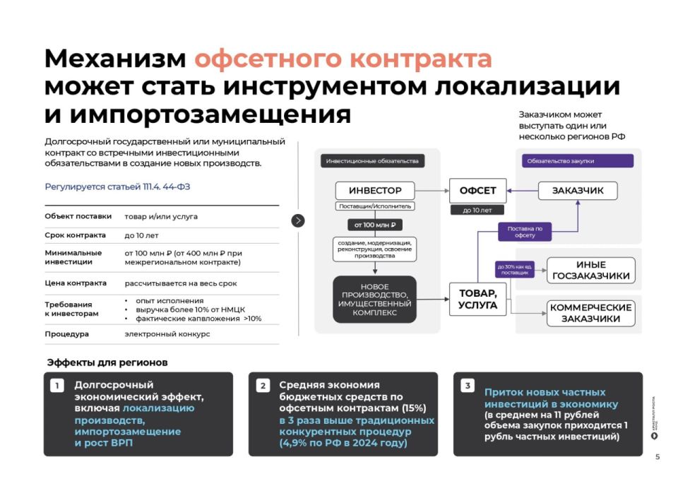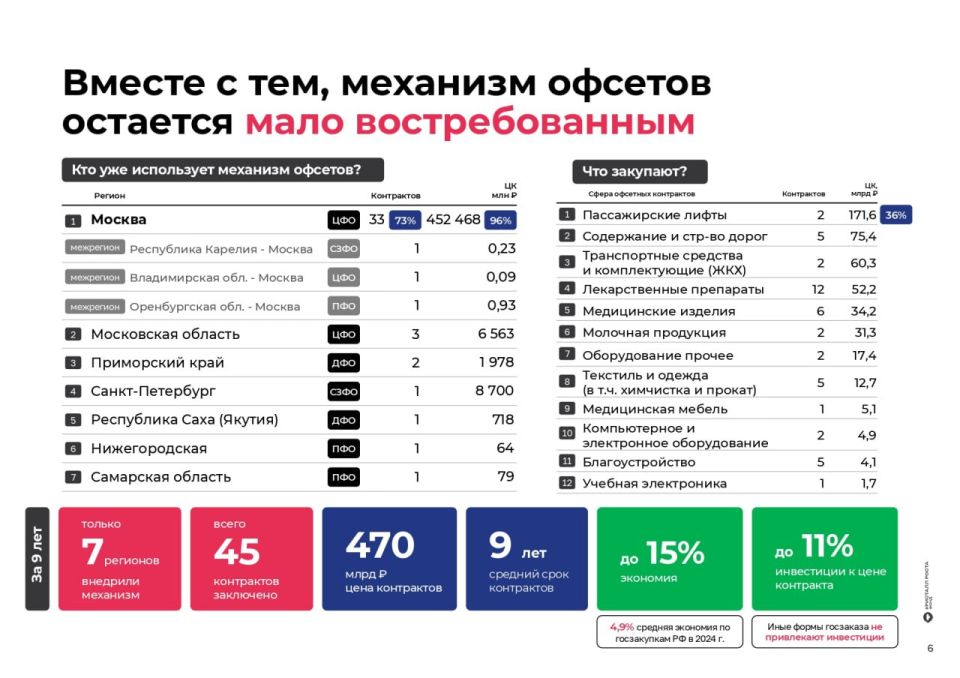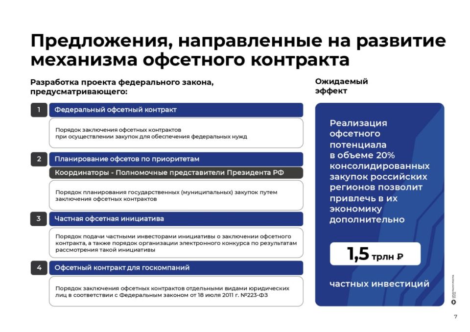 «По оценке Фонда «Кристалл роста», доля импорта в региональных госзакупках промышленной продукции до сих пор составляет 40%, его большая часть приходится на поставки из недружественных стран, что прямо противоречит интересам экономической безопасности России. При этом офсетные контракты могут не только решить задачи импортозамещения, но и дать российским регионам дополнительно 1,5 трлн рублей капиталовложений, — подчеркнул Александр Галушка