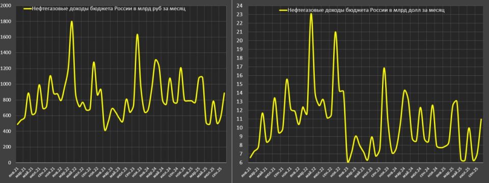 Учитывая вероятные проблемы с поставками нефти в Индию, нефтегазовые доходы в ноябре-декабре этого года могут составить в совокупности около 1 трлн vs 1.6 трлн годом ранее.