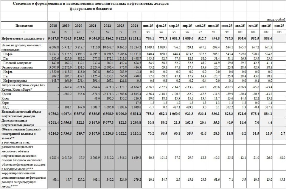 За 10м25 нефтегазовые доходы составили 7.5 трлн (-21.4% г/г) vs 9.54 трлн за 10м24 и 7.2 трлн за 10м23.
