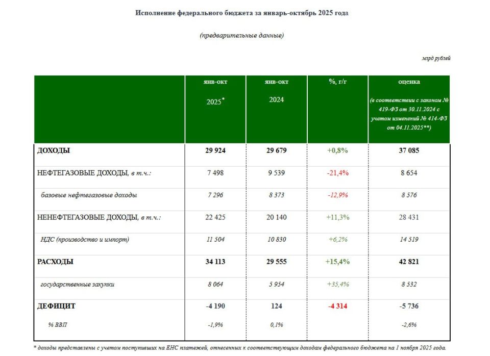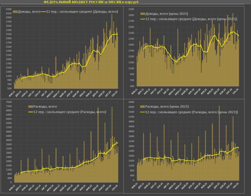 Какие планы Минфина? 37 трлн доходов по итогам 2025, для этого необходимо показать сопоставимую с 2024 годом динамику сборов в ноябре-декабре, но это не так просто, т.к. нефтегазовые доходы сокращаются на 27-30% г/г с тенденцией на ухудшение, особенно на фоне крепкого рубля (в том году рубль был выше 100), слабой конъюнктуры и усиления санкций (многие НПЗ в Китае и Индии отказываются или замораживают поставки нефти).