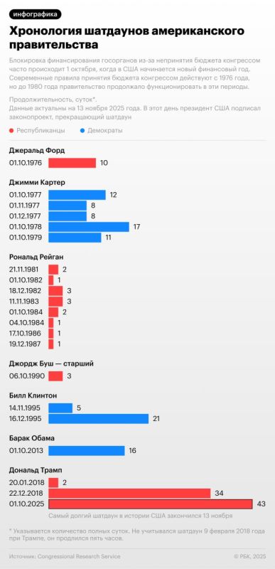 Во время первого срока Трампа правительство приостанавливало свою работу в общей сложности на 36 суток. 22 октября в сумме длительность всех шатдаунов при республиканце достигла 57 суток (предыдущий рекорд — 56 — был установлен демократом, 39-м президентом США Джимми Картером). А к 13 ноября общая продолжительность шатдаунов при Трампе достигла 79 дней.