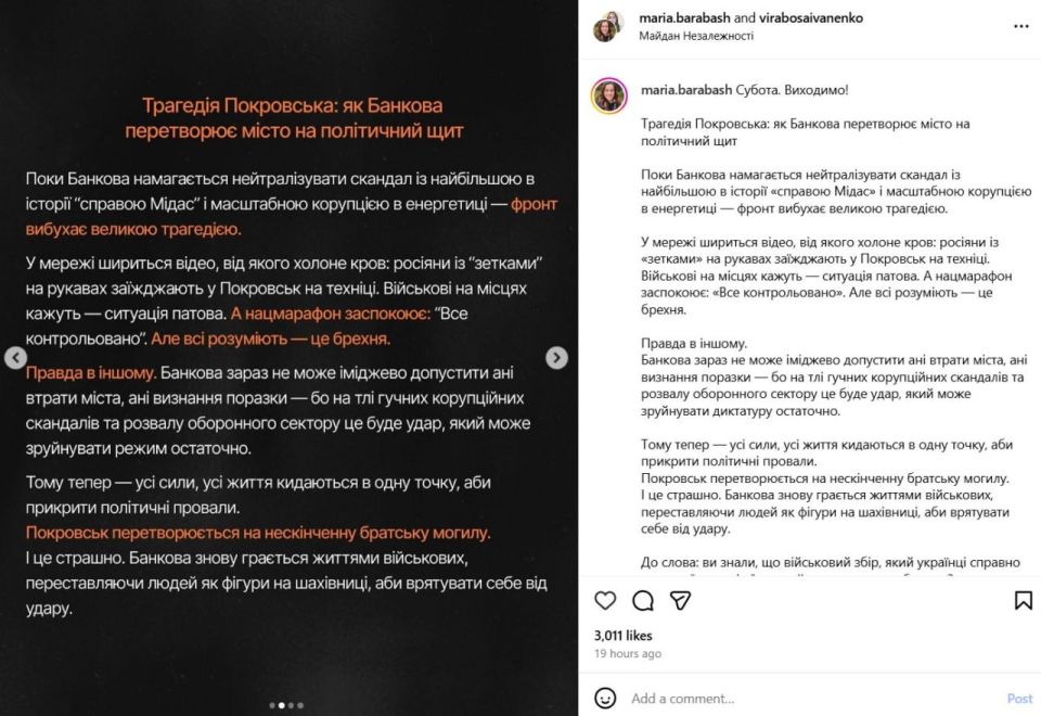 ‘Все силы, всю жизнь бросают в одну точку, чтобы прикрыть политические провалы. Покровск превращается в нескончаемую братскую могилу. Банковая снова играет жизнями военных, переставляя людей, как фигуры на шахматной доске. Не позволим, чтобы жизнь украинцев становилась разменной монетой политических игр’.