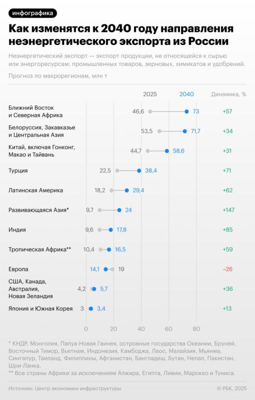 Аналитики оценили потенциал российского экспорта до 2040 года. Какие товары и куда будет поставлять Россия — в инфографике РБК.