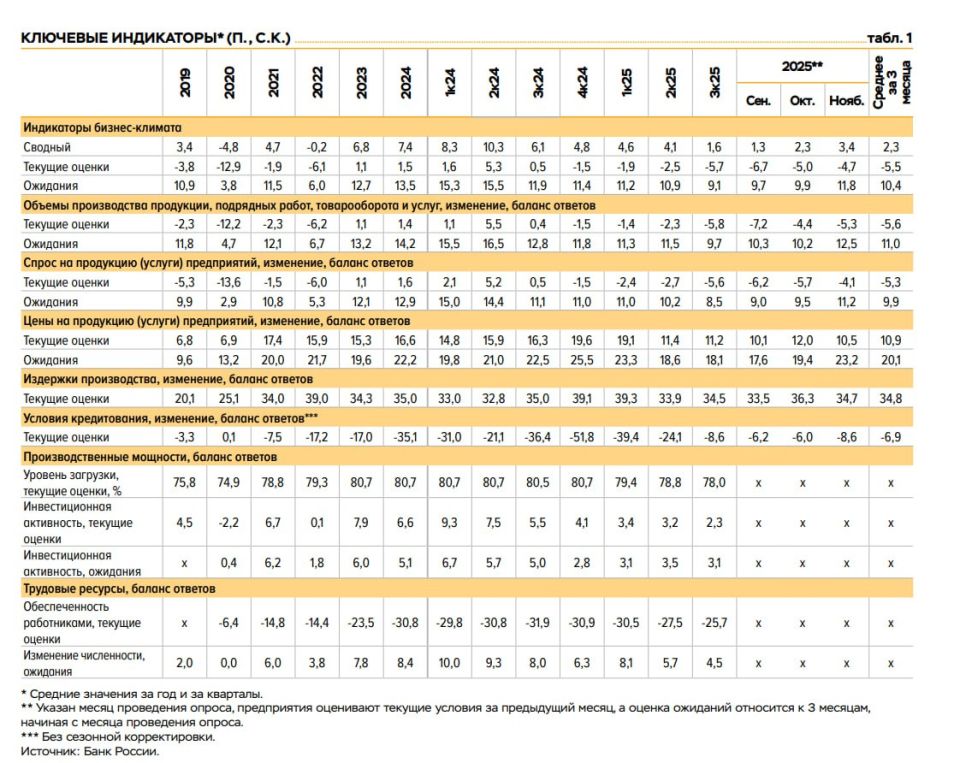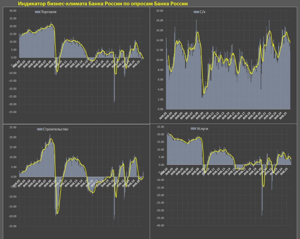 Индикатор бизнес-климата в России вырос до 3.4п в октябре (ноябрьский опрос) после 2.3п в сентябре, что является максимальным уровнем с апр.25 (минимум был в авг.25 – 1.3п и столько же в июн.25).