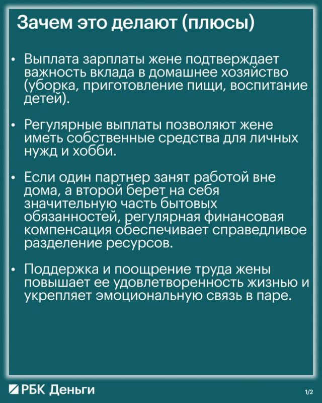 Некоторые экономисты называют справедливую зарплату жены на уровне ~ 35 000 рублей в месяц. При этом законодательно такой обязательной выплаты нет — это частная договоренность между партнерами.