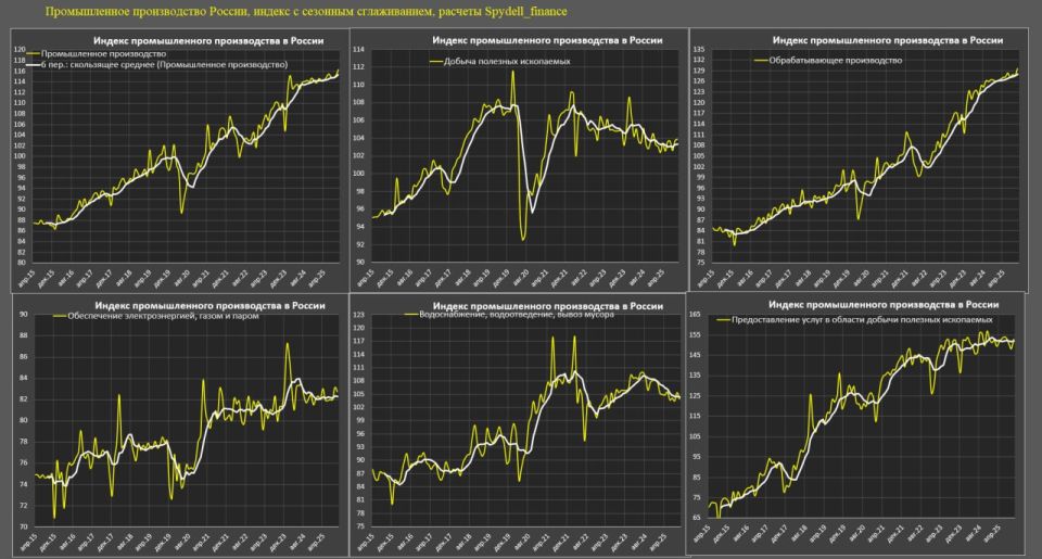 Основной вклад в рост оказала обрабатывающая промышленность, месячный прирост в которой оказался сильнейшим за 5 лет (+4.5% м/м SA), превзойдя на 0.9% прошлый максимум в дек.24.