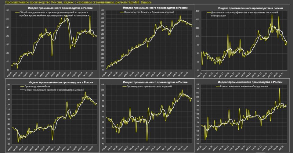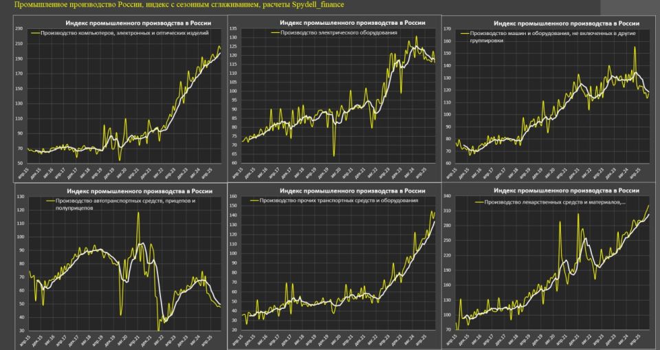 Весь основной вклад обусловлен аномальной активностью в производстве прочих транспортных средства (беспилотники, ракеты МБР, бронетехника, авиация, флот), где рост составил 40.8% г/г, произошло ускорение роста в производстве готовых металлических изделий (оружие, патроны, снаряды, тактические ракеты) до 19.7% г/г, продолжает быстро расти производство микроэлектроники и компонентов (практически полностью на госзаказах) +9.1% г/г.