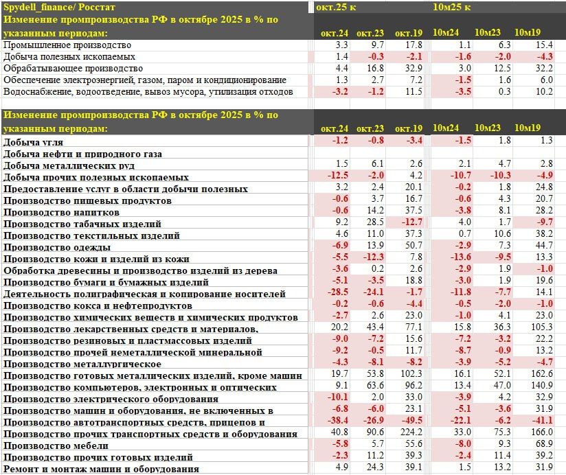 • Нефтепереработка: (-0.2)% г/г в октябре, (-0.6%) к окт.23, (-4.4%) к окт.19, за 10м25 (-0.5%) г/г, (-2.0%) к 10м23 и (-1.04%). Далее в указанной последовательности. Удивительно, но кризис на топливном рынке во многом из-за известных событий никак не отразился на производстве по версии Росстата.