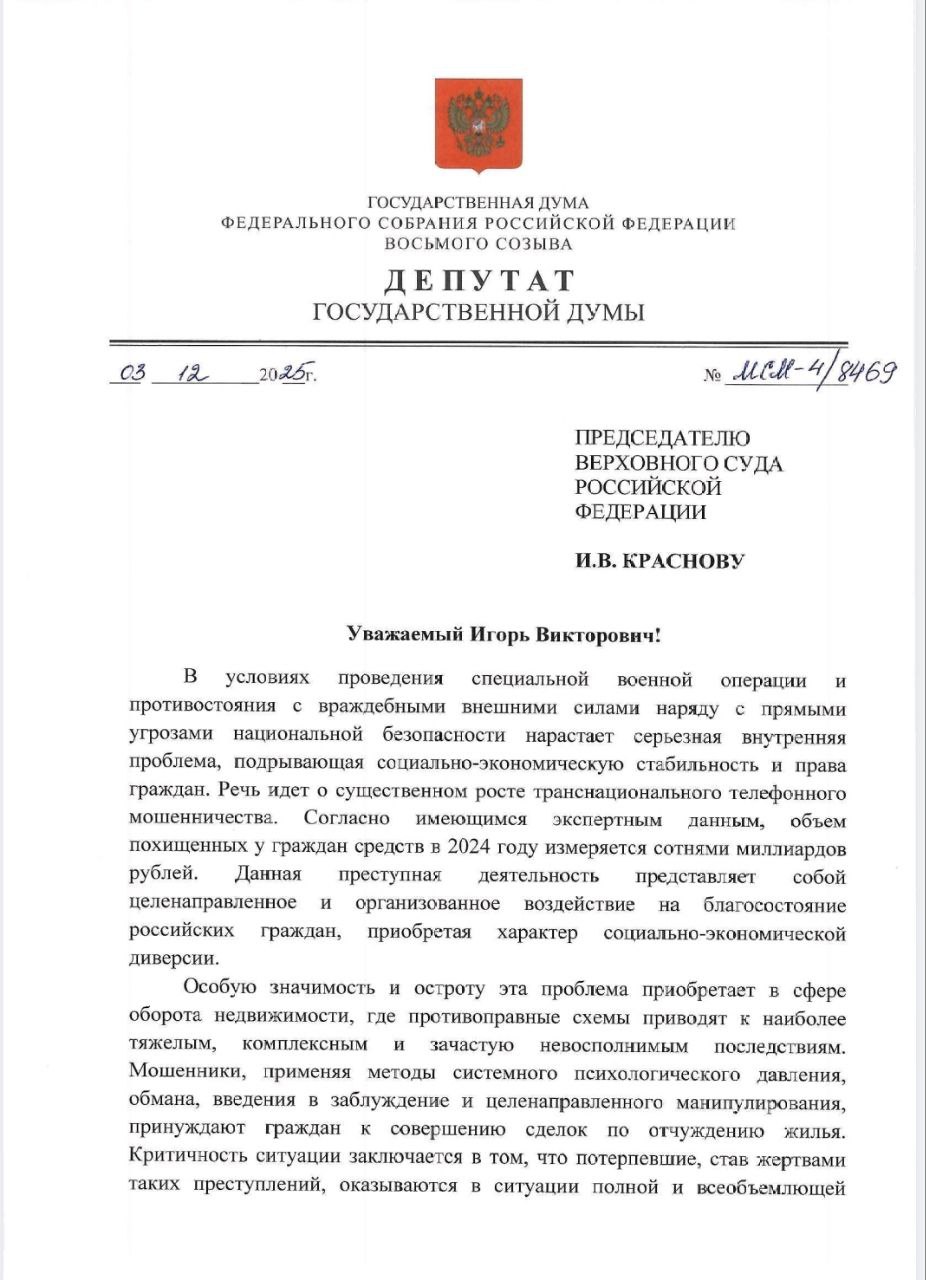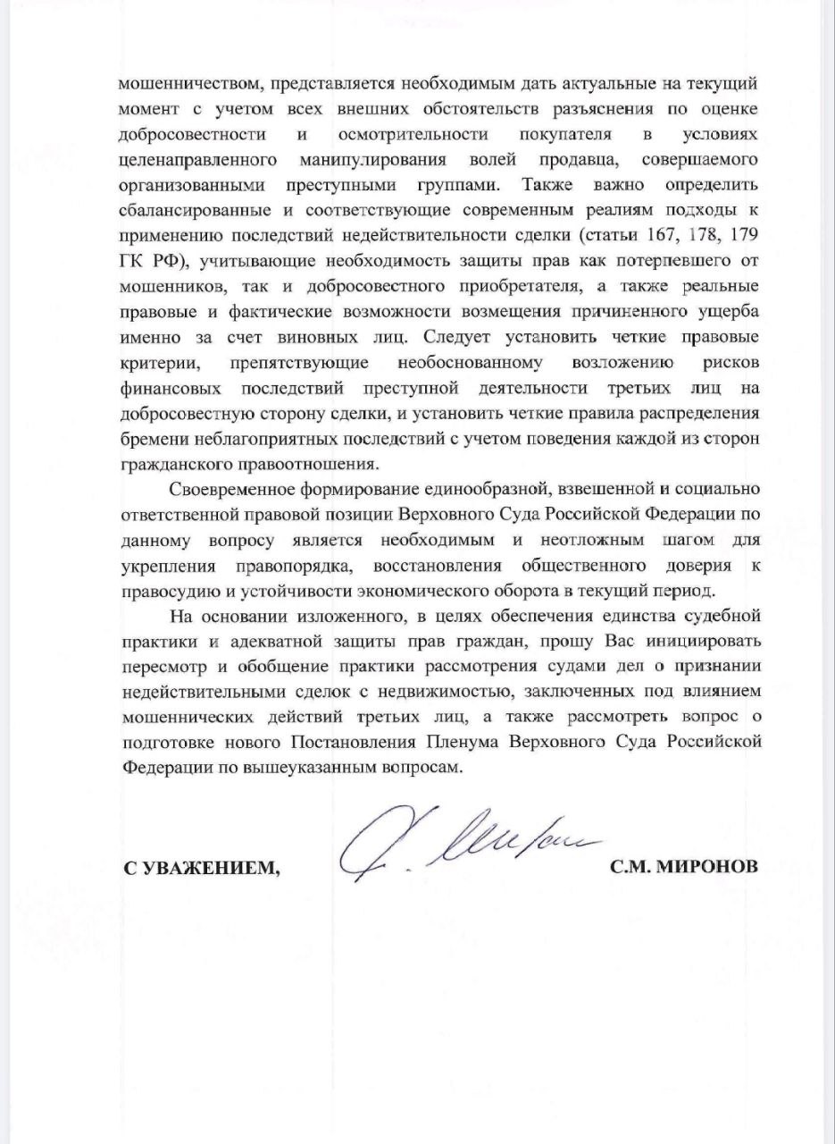 Направил официальное обращение председателю Верховного суда Игорю Краснову в связи с мошенническими схемами на рынке «вторички» и решениями судов, которые оставляют добросовестных покупателей без жилья и без денег.