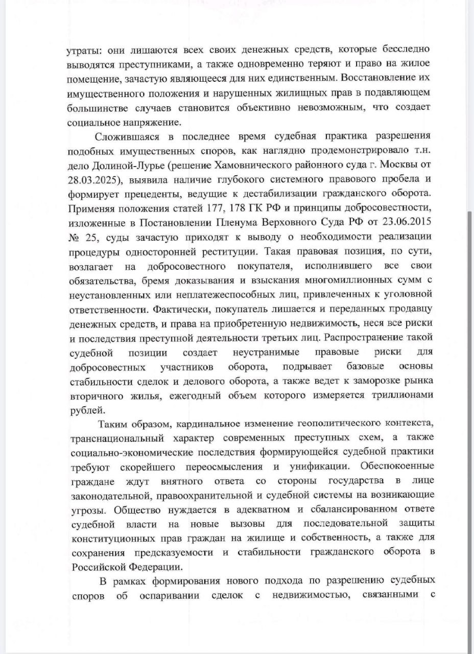 Прошу Верховный суд дать актуальные разъяснения, определить справедливые подходы по защите и продавцов, и покупателей. Инициировать пересмотр и обобщение судебной практики по аннулированию сделок, а также сформировать четкую позицию по этим вопросам в рамках нового Постановления пленума ВС РФ.