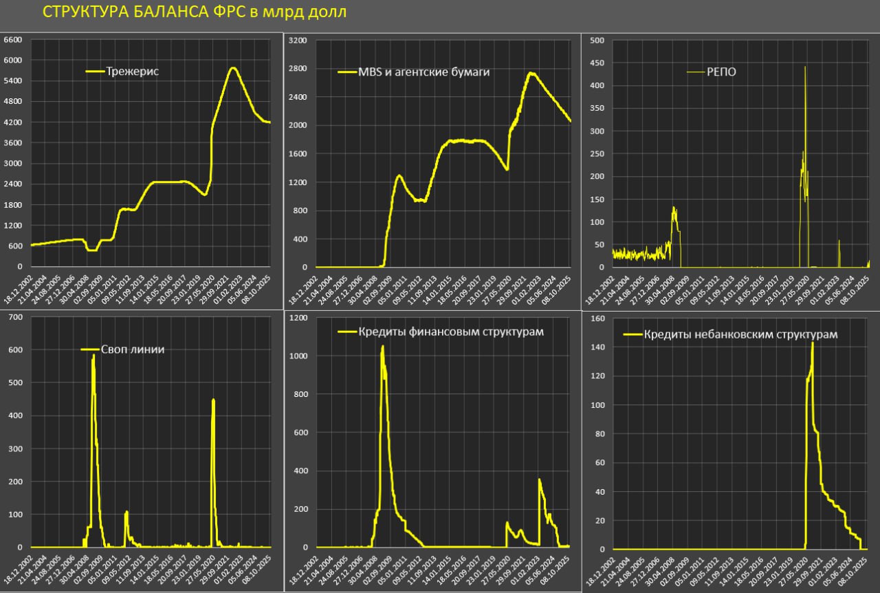 Сокращение баланса за 3.5 года убрало менее половины от фазы монетарного бешенства, но, с другой стороны, привело к «размазыванию» ликвидности, т.е. средний прирост за 6 лет (2020-2025 включительно) составляет около 415 млрд в год, а не по 2.5 трлн в год, как в эпоху монетарного бешенства.