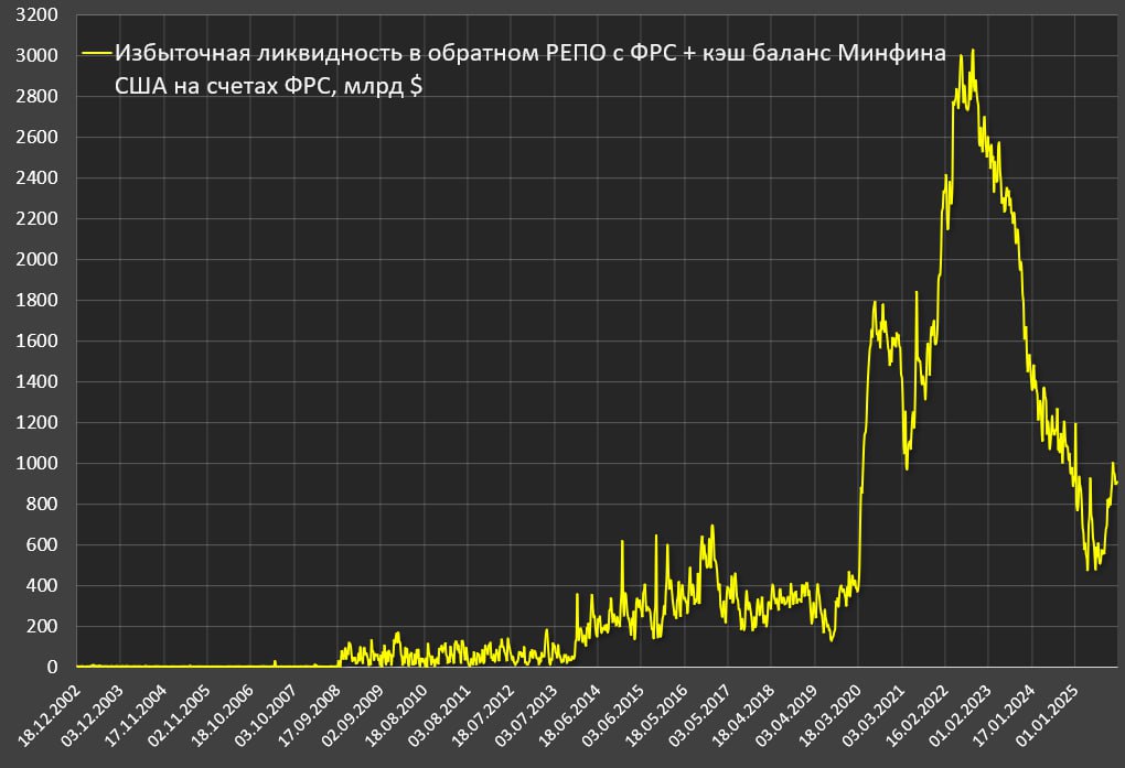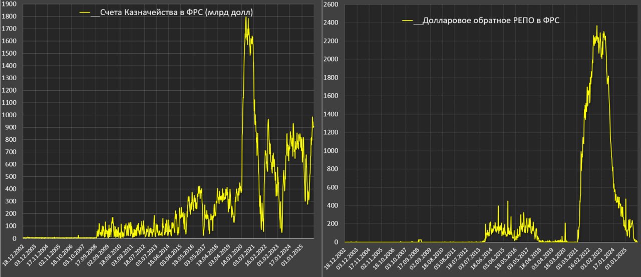 Обратное РЕПО в ФРС обнулилось еще в середине авг.25 (средний 4-недельный уровень упал ниже 50 млрд), до этого в 1П25 держались в среднем на уровне 160 млрд.