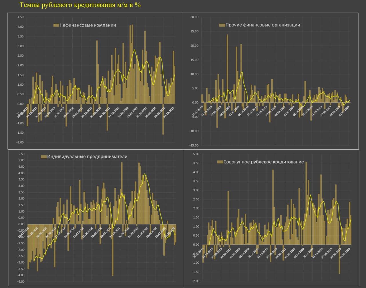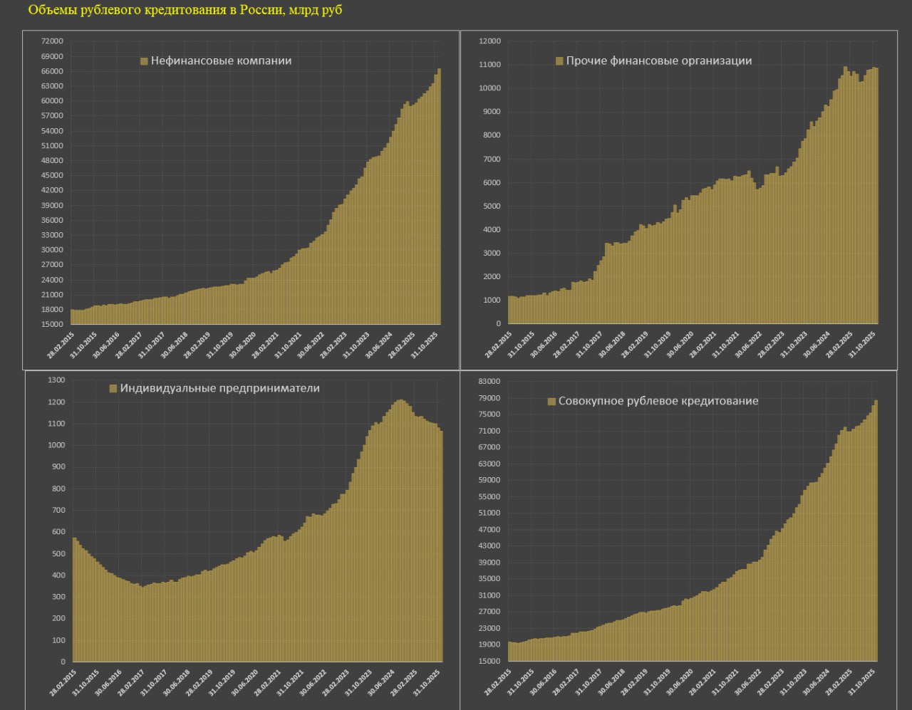 Совокупное корпоративное рублевое кредитование (нефинансовый сектор, прочие финансовые организации и ИП) выросло на 1.63% м/м в ноябре после 2.37% в октябре. За 3м – 1.64%, 6м – 1.40%, 12м – 0.84%, 11м25 – 0.79% vs 1.81% за 11м24, в 2024 – 1.77%, 2023 – 1.90%, в 2017-2019 – 0.75%.