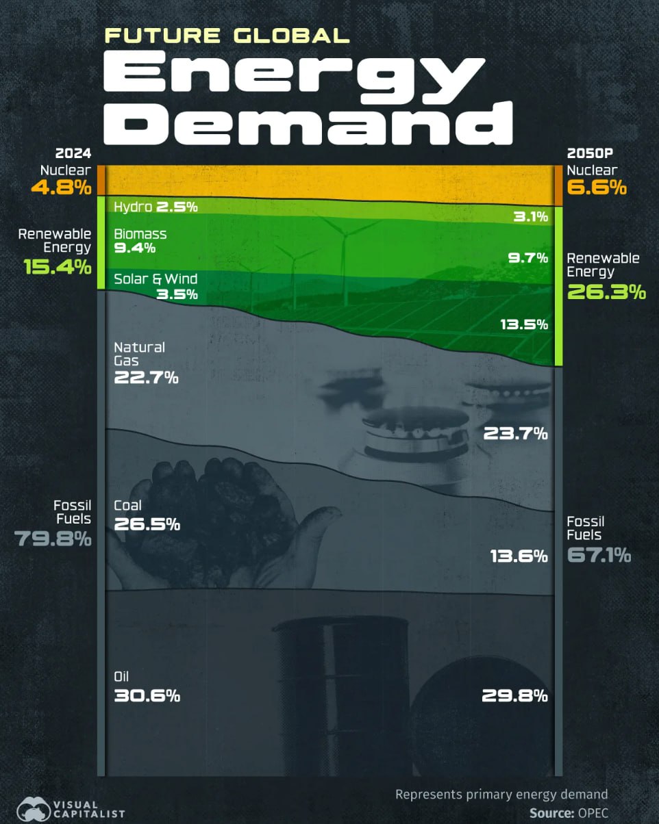 в 2024 году на ископаемое топливо приходилось 80% мирового спроса на энергию. К 2050-му, согласно прогнозам, эта доля сократится до 67%.