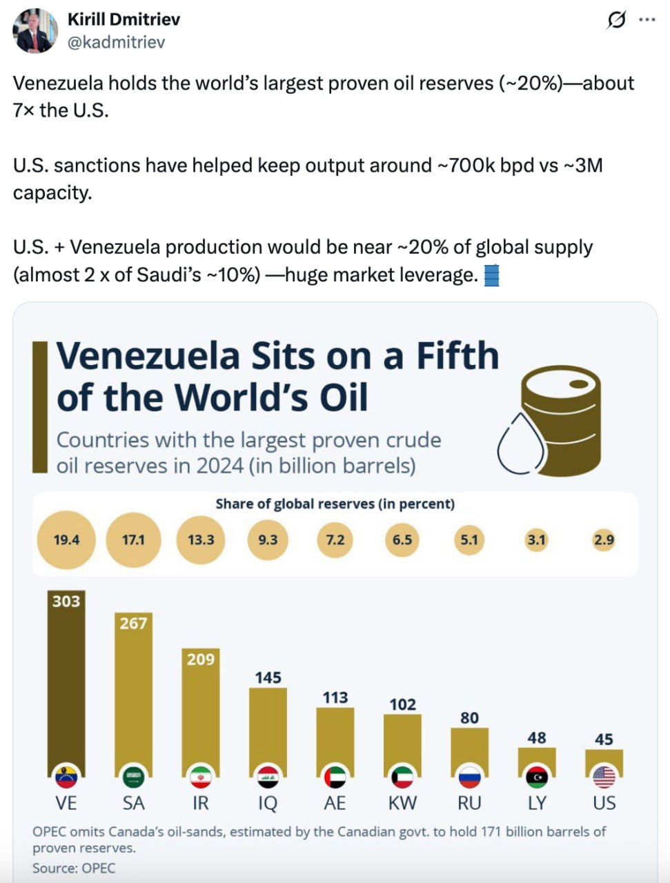 Венесуэла обладает крупнейшими запасами нефти почти в 20% от мировых объемов, напомнил в соцсети Х Кирилл Дмитриев.