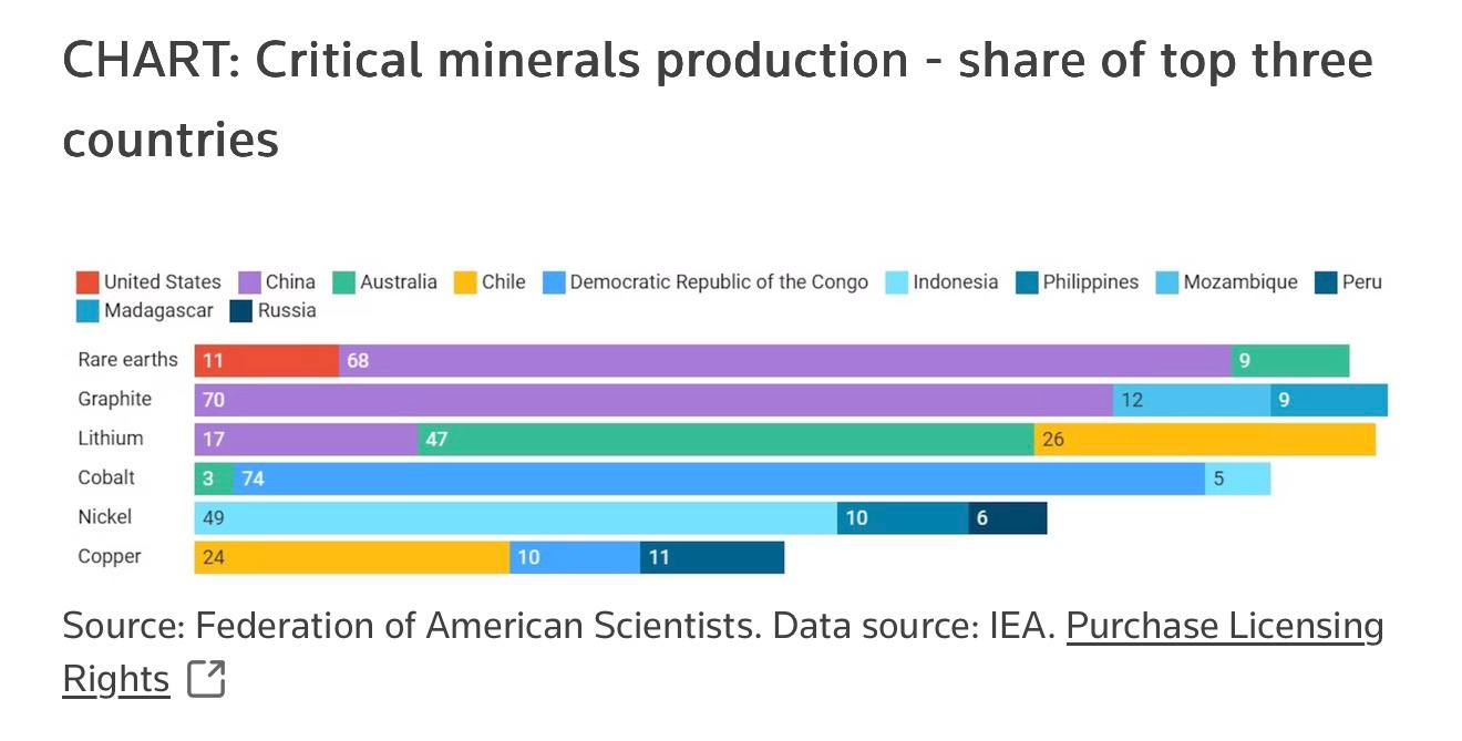 По данным Евростата, в 2024 году 95% импорта редкоземельных элементов в ЕС приходилось всего на 3 страны: Китай, Малайзию и Россию. На Китай приходится 32% мирового производства лития, а китайские компании контролируют еще 18%, базируясь в других странах, включая Аргентину и Мексику.