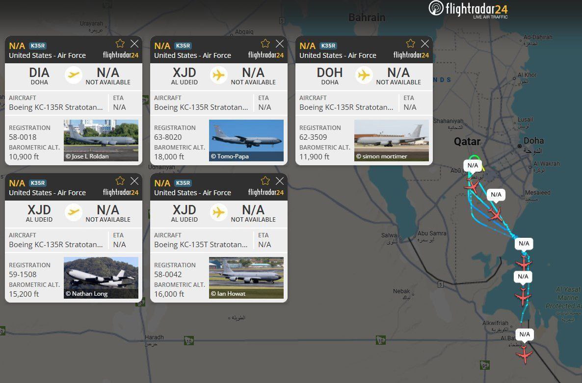 Не менее пяти самолётов - заправщиков KC-135 Stratotanker ВВС США внезапно вылетели с авиабазы Эль-Удейд в Катаре на фоне ожидаемого удара по Ирану.