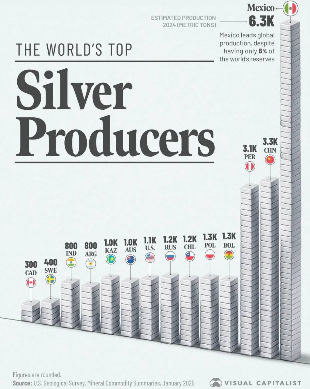 Мексика занимает 1-е место в мире по добыче серебра (6300 метрических тонн), несмотря на то, что располагает лишь 6% мировых известных запасов.