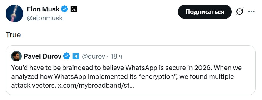 Илон Маск согласился с выводами Павла Дурова о том, что нельзя верить в безопасность WhatsApp.