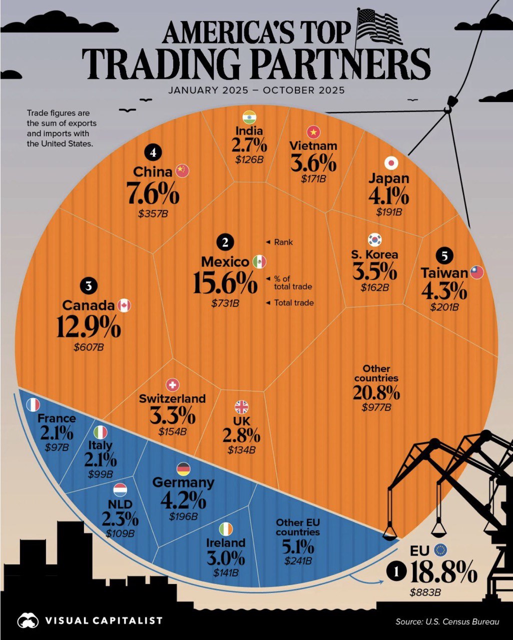 Объем двусторонней торговли США с января по октябрь 2025 года достиг $4,7 трлн — нестабильный год для торговой политики.