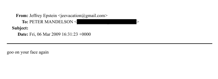 Такое короткое сообщения от Эпштейна экс-послу Великобритании Питеру Мандельсону нашли в переписках финансиста.