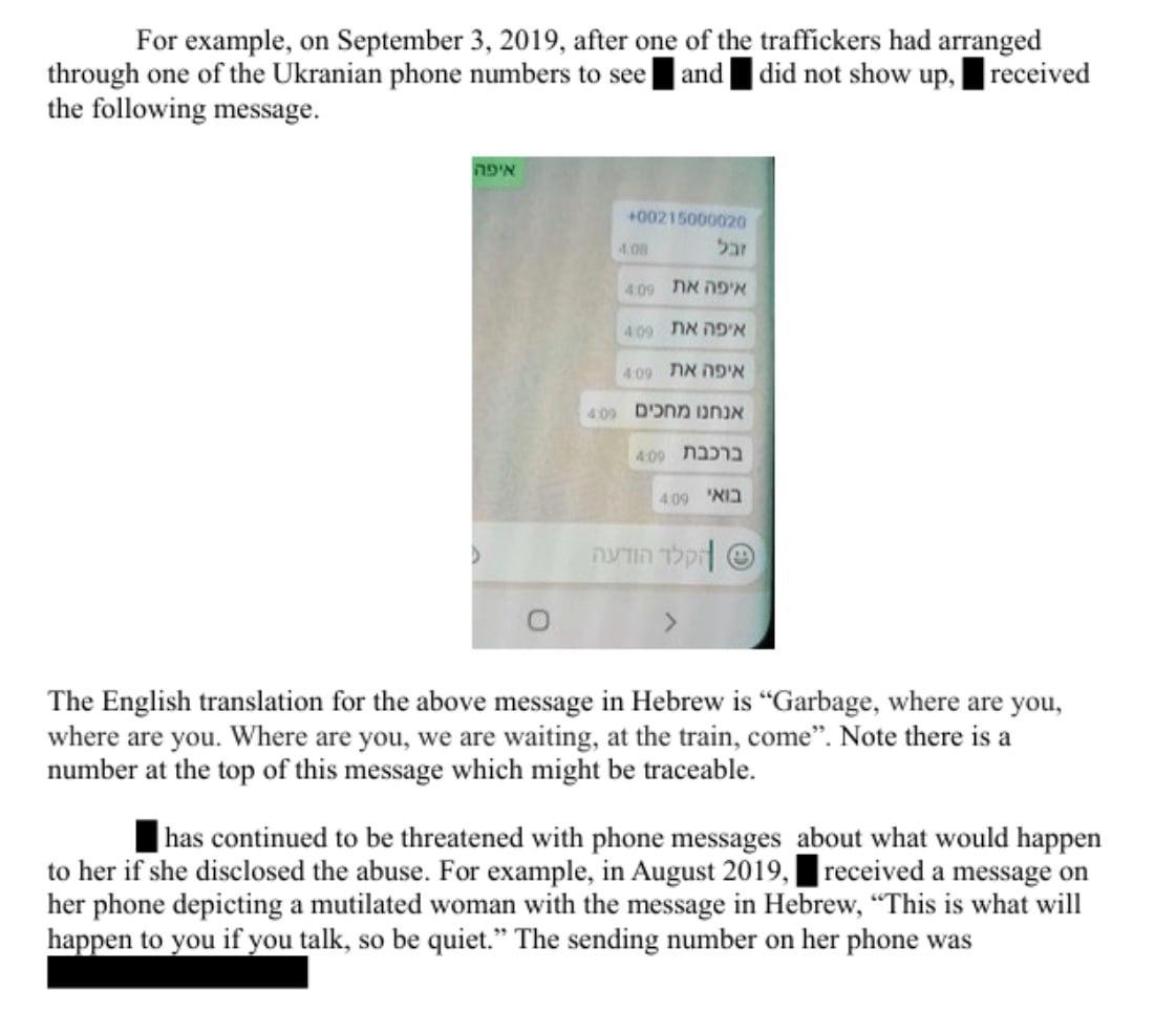 После того как одна из девушек не явилась на встречу, предположительно, с торговцем людьми, ей начали поступать оскорбления на иврите и фото изувеченных женщин с предупреждением молчать.