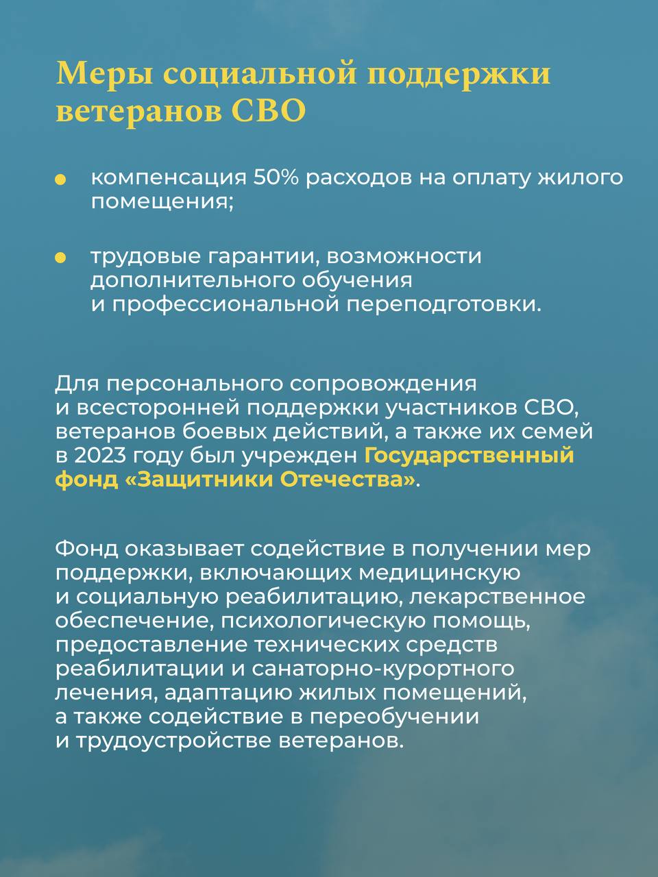 Подробнее о том, какие меры соцподдержки действуют для участников и ветеранов СВО, рассказали в карточках