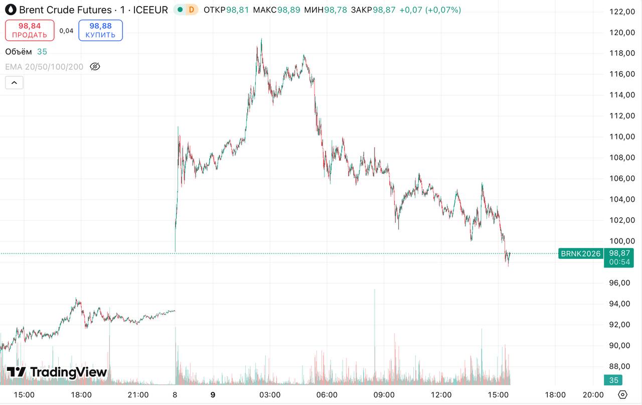 Цена нефти Brent упала ниже $100, хотя на максимуме доходила до $119,5