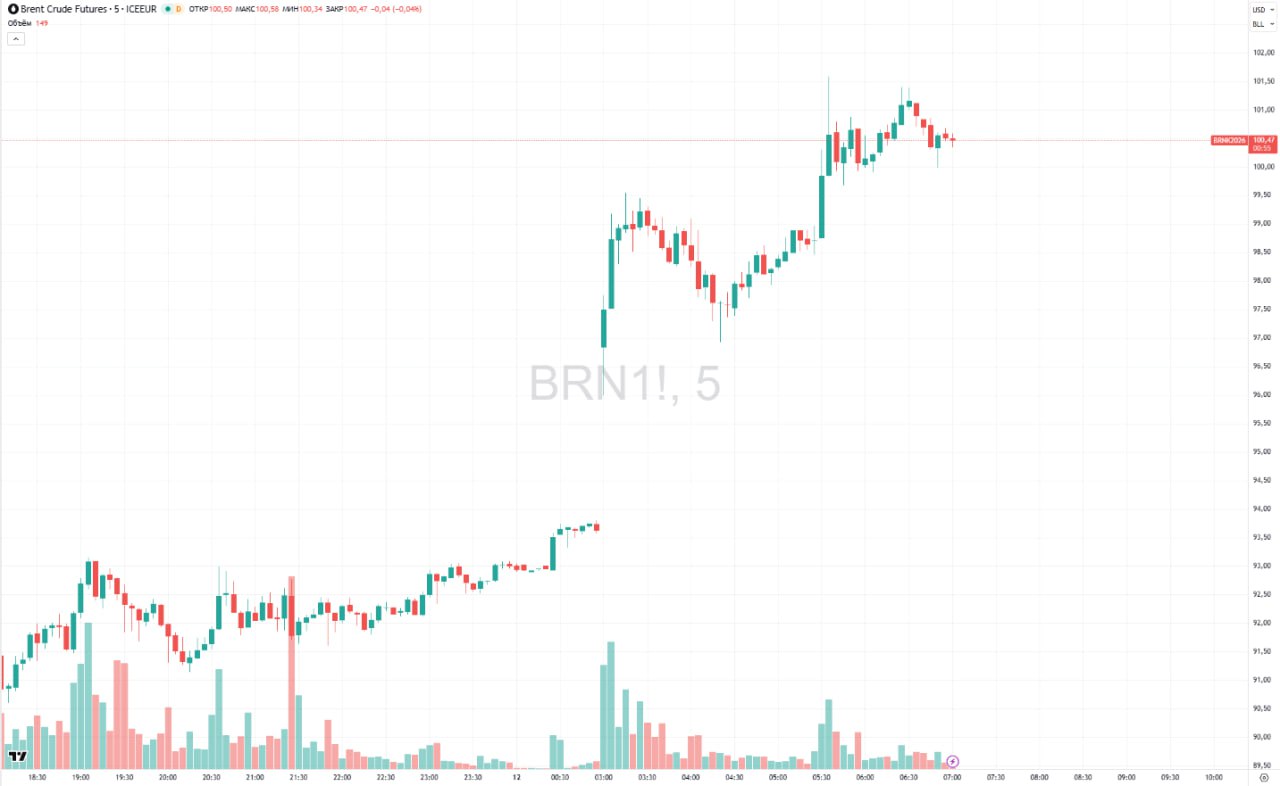 На пике котировки майских фьючерсов на нефть Brent на бирже ICE прибавляли 10,45%, до $101,59 за баррель.