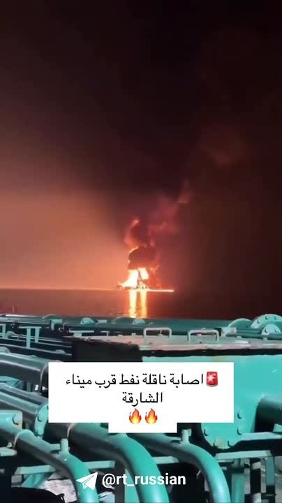 Американский танкер загорелся после атаки в Шардже (ОАЭ). Об этом пишетиранский телеканал Press TV и публикует кадры.