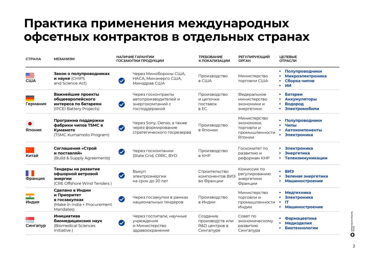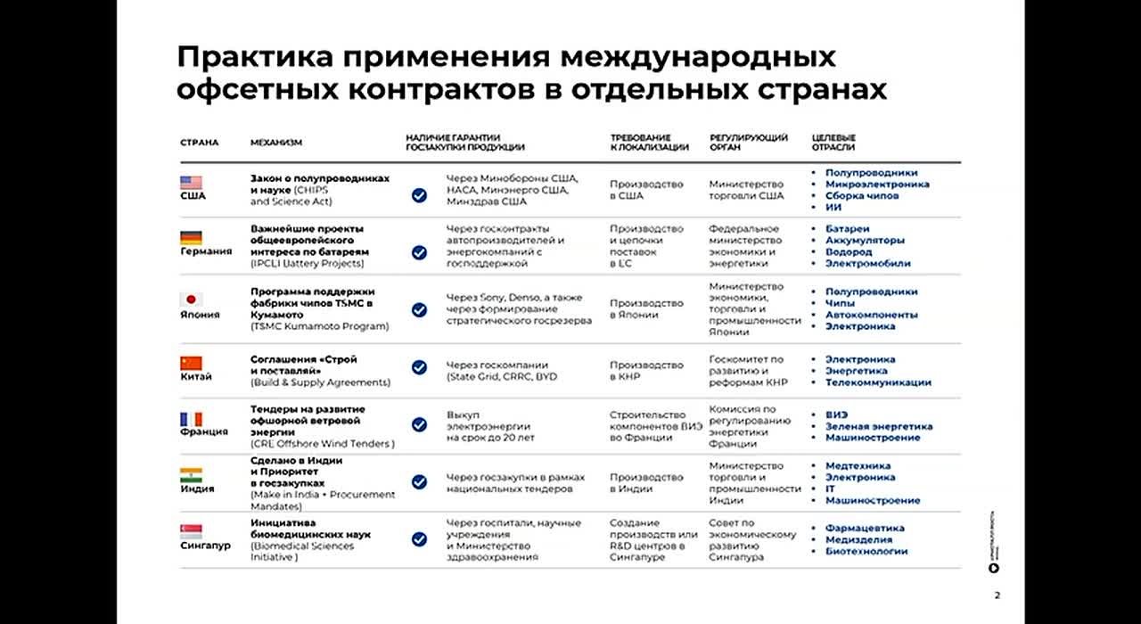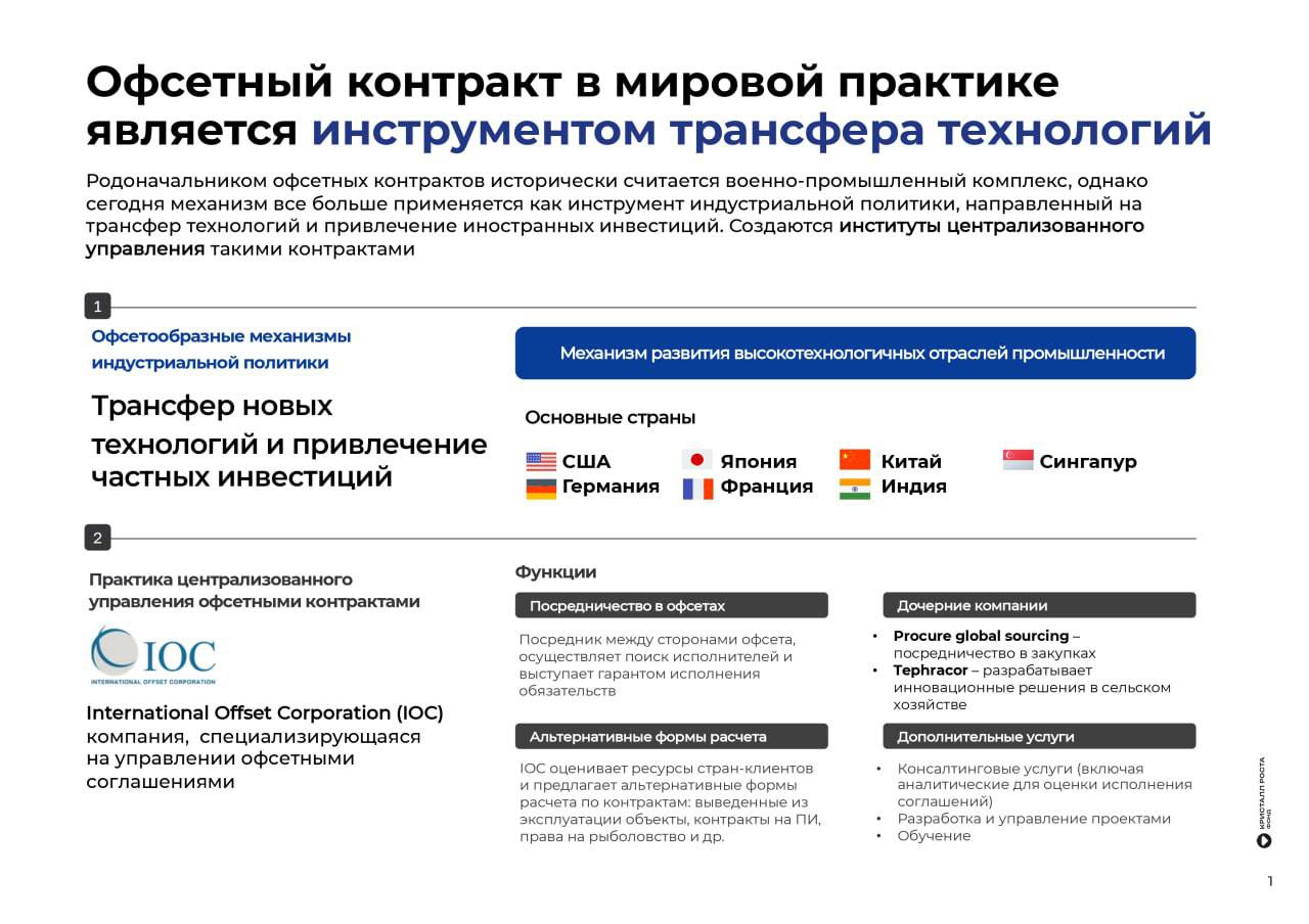 В мире офсеты широко используются для обеспечения технологического суверенитета и лидерства, импортозамещения, создания новых отраслей промышленности. Практика офсетного контракта успешно реализуется в ведущих экономиках мира, включая США, Китай, Индию, Германию, Японию. В России она почти не используется: за 9 лет заключено всего 53 контракта в 14 субъектах