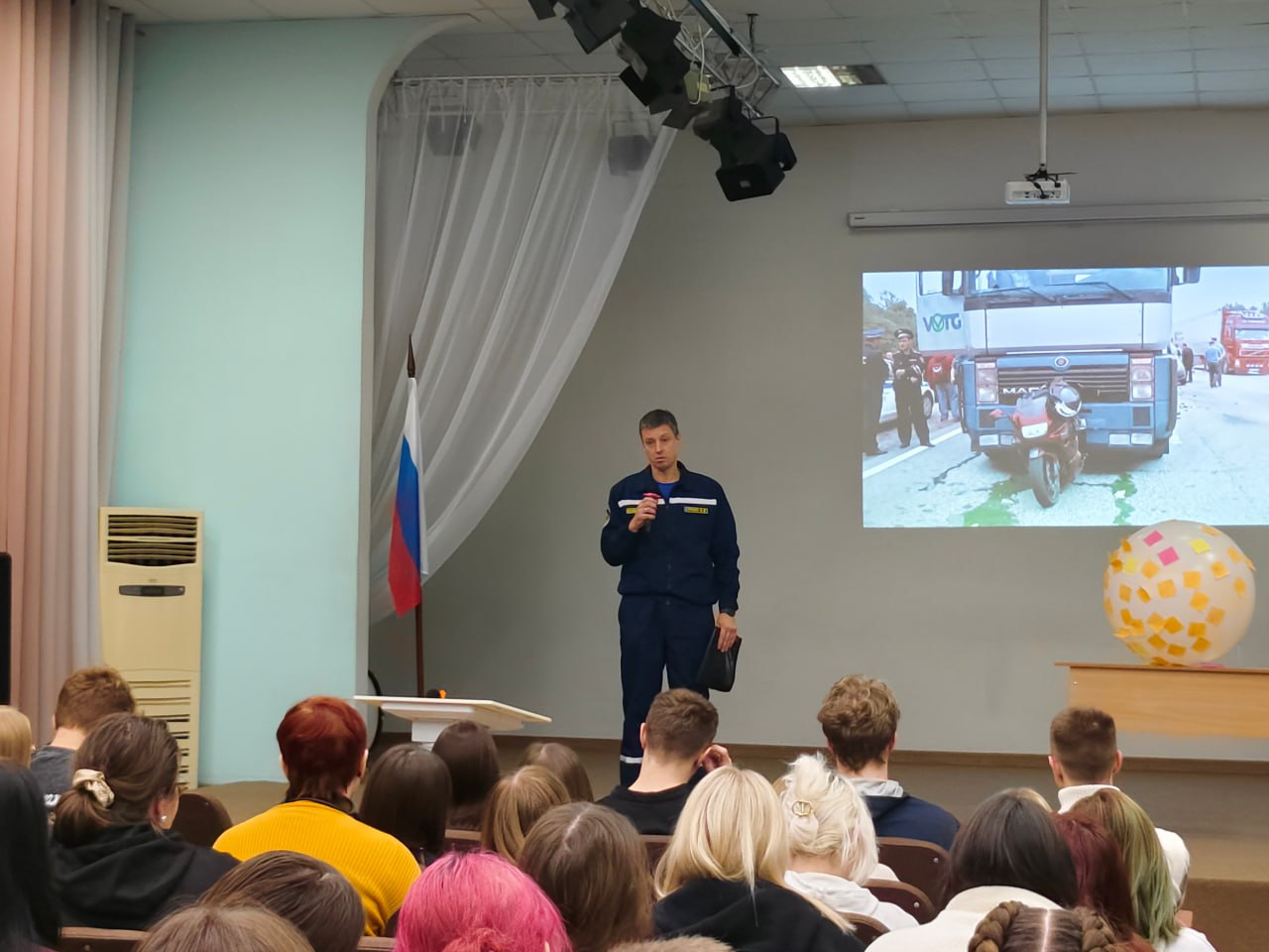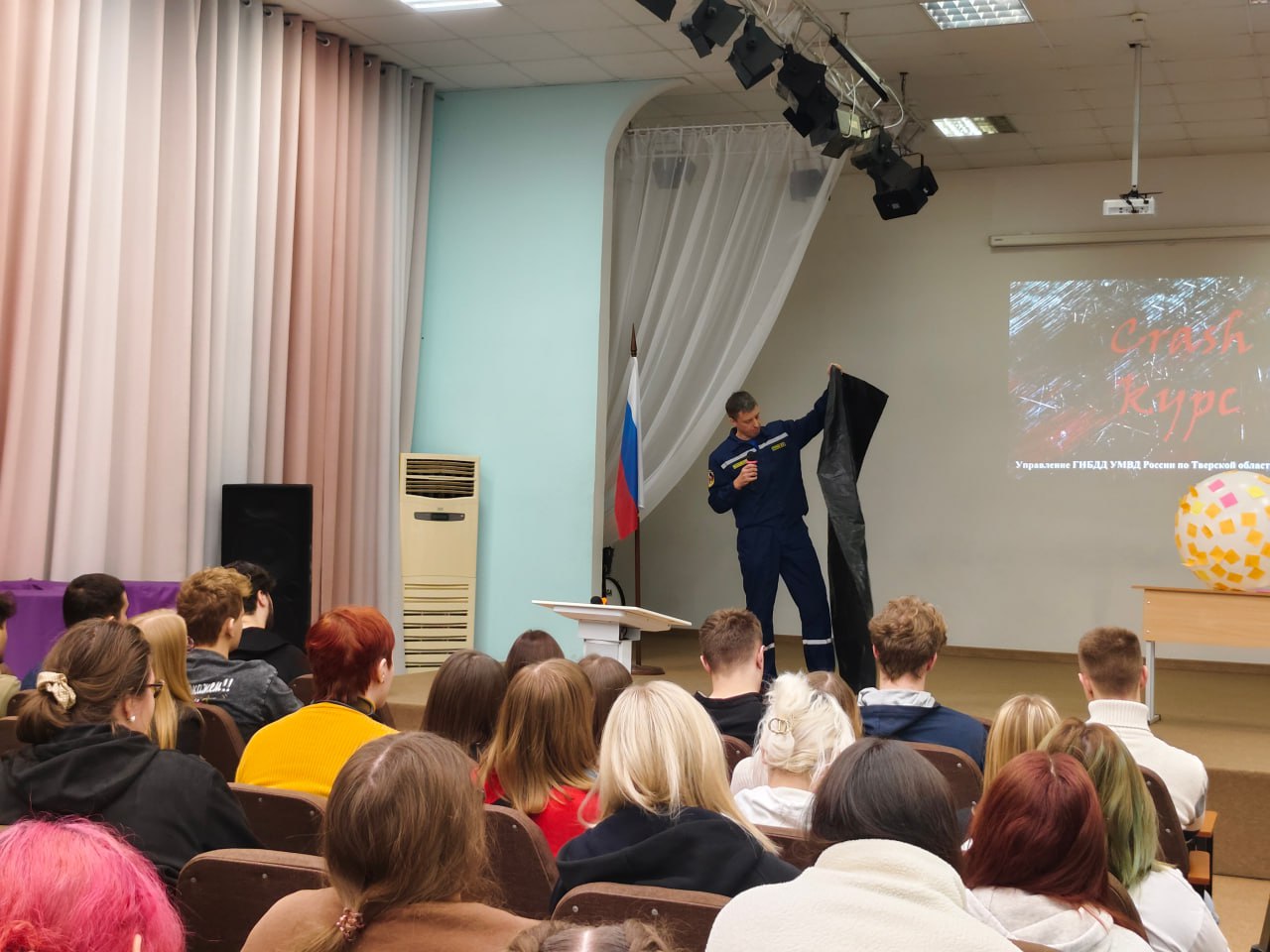 Чтобы привлечь внимание молодого поколения к всеобщей проблеме безопасности на дорогах, 27 ноября 2025 года в Тверском промышленно-экономическом колледже для студентов старших курсов состоялось мероприятие «Краш-курс». Эмоциональные выступления сотрудников Госавтоинспекции, МЧС, медиков и людей, ставших участниками дорожных происшествий, не могут оставить равнодушными зрителей. Мероприятие началось с того, что молодым людям предложили написать на стикерах свои планы на будущее, желания и мечты, которые они разместили на воздушном шаре, символизирующем жизнь. Этот момент создал атмосферу надежды и позитивного взгляда в будущее, но за ним последовала серьёзная беседа о реальных рисках, с которыми сталкиваются участники дорожного движения.