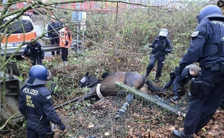 Полицейская лошадь упала в яму во время разгона митинга леворадикальных протестующих против молодежного съезда партии "Альтернативы для Германии" в немецком Гисене.
