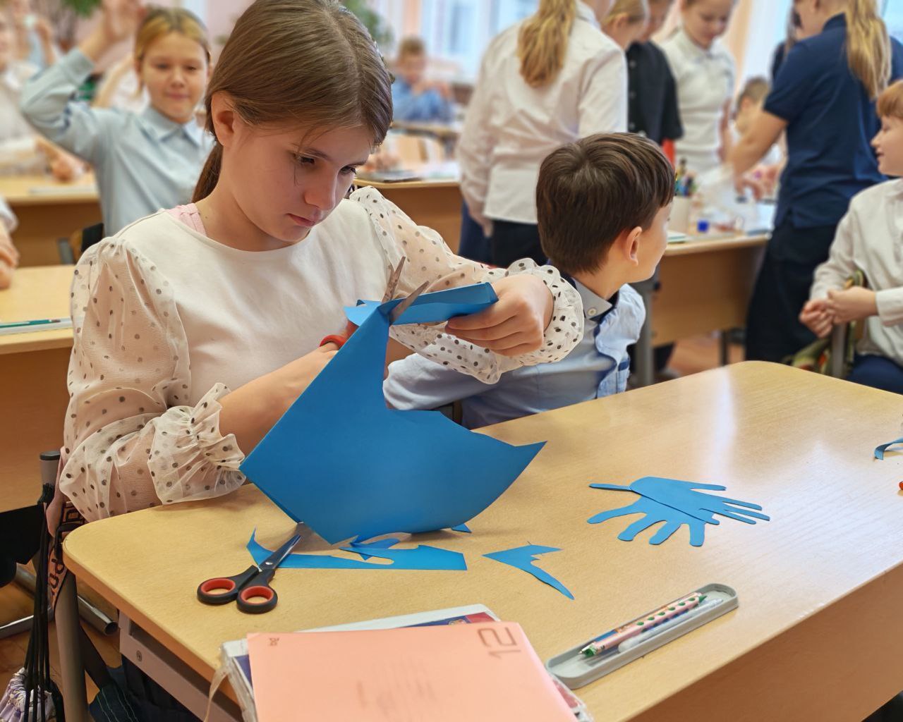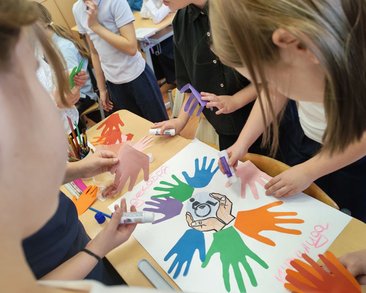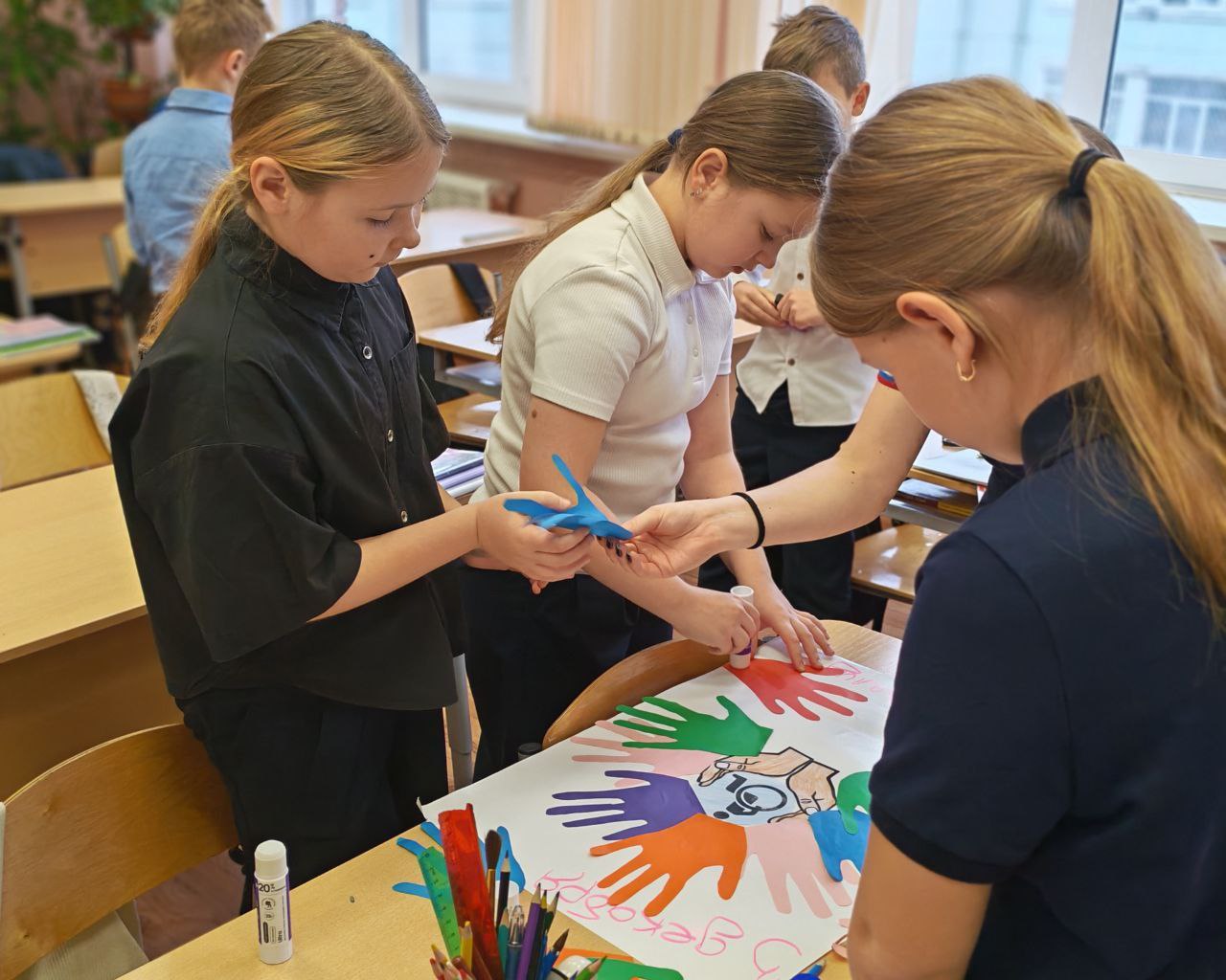 В рамках мероприятия кадеты под руководством инспекторов Госавтоинспекции своими руками создали тематический плакат под названием "Руки добра". Этот яркий и трогательный плакат символизирует поддержку, взаимопомощь и солидарность. В его центре – изображение рук, бережно поддерживающих символ доступной среды, окруженное многочисленными разноцветными отпечатками детских ладоней. Каждая "рука" на плакате – это символ готовности помочь и проявить заботу.