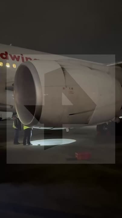 На кадрах РЕН ТВ — черные полосы на белом воздушном судне. Пассажиры выходят из самолета и следуют к автобусу.