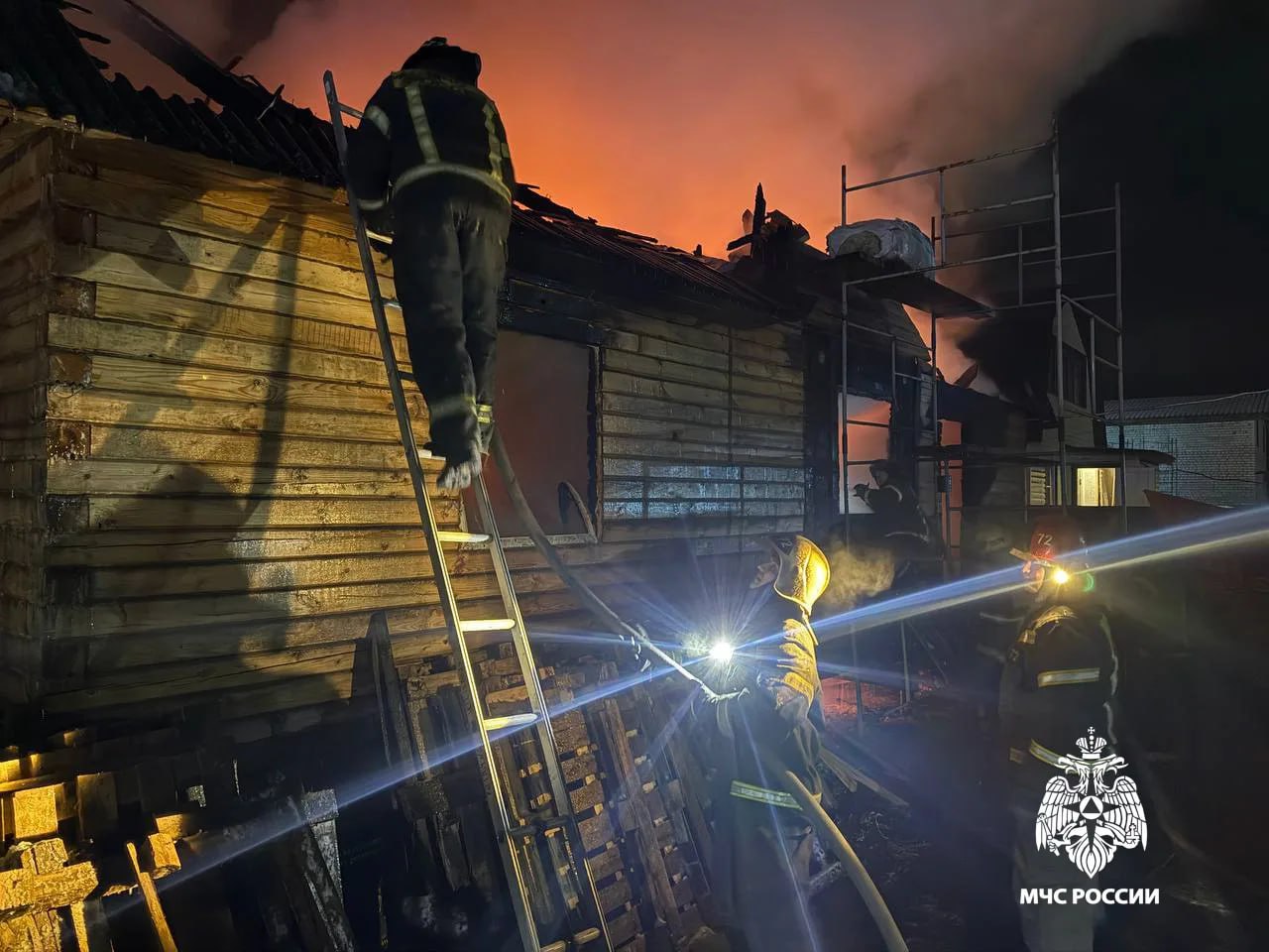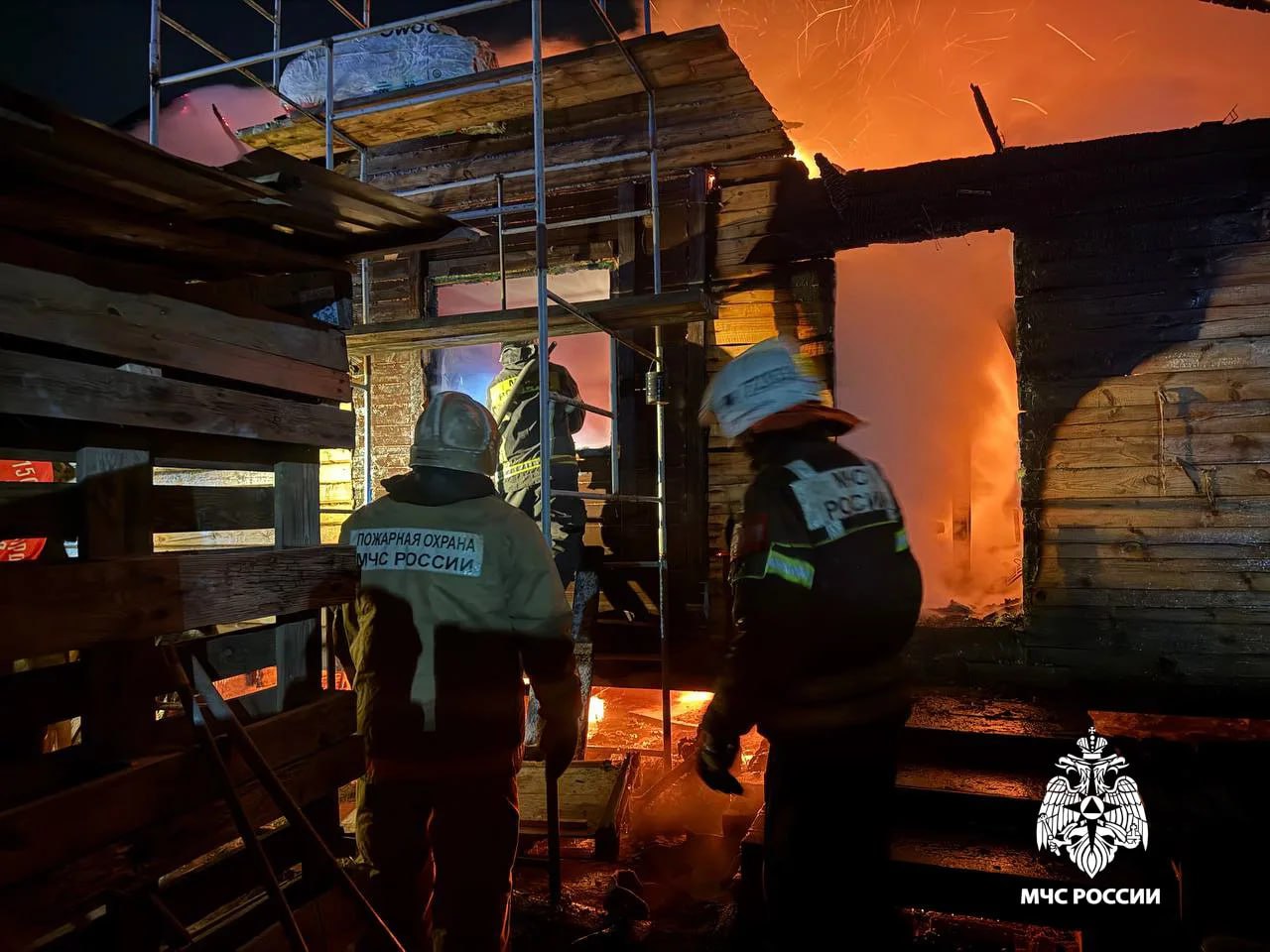 Спасатели не допустили перехода огня на соседний жилой дом. С огнем борются отделения пожарно-спасательных частей №3, №72 и СПСЧ.