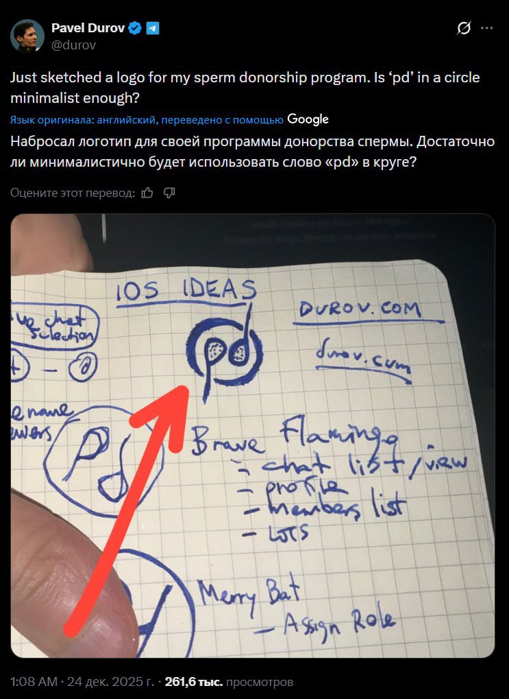 Ранее основатель Telegram опубликовал в Х набросок логотипа для своей "программы по донорству спермы". Рисунок представляет собой английские буквы "р" и "d", расположенные в кругу. Предприниматель спросил у подписчиков, "достаточно ли минималистично" это будет выглядеть.