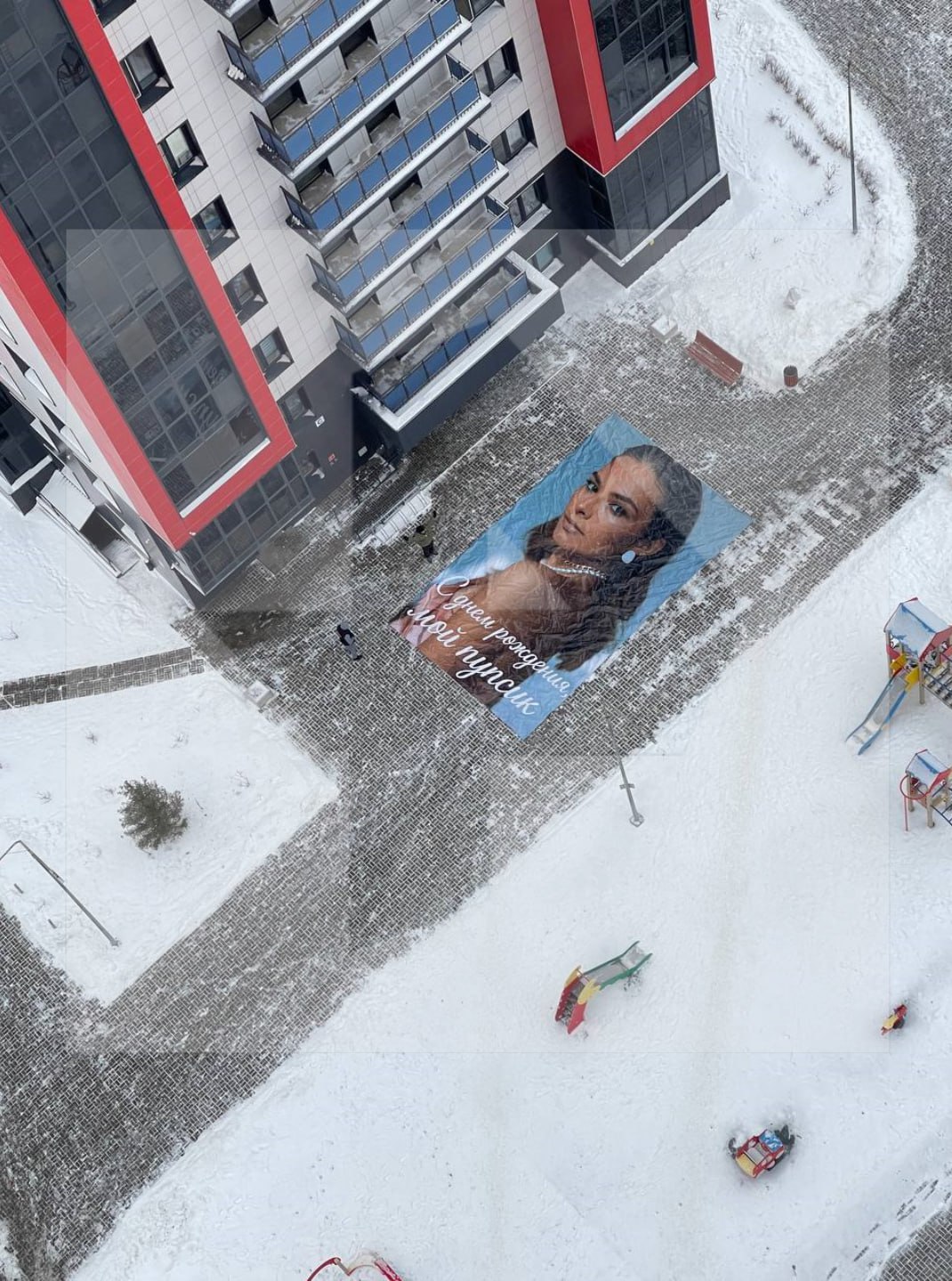 Мужчина решил сделать супруге оригинальный подарок и распечатал многометровый плакат с ее фото. После этого он договорился с главой управляющей компании и вывесил его на общих балконах соседнего дома на четырех этажах.