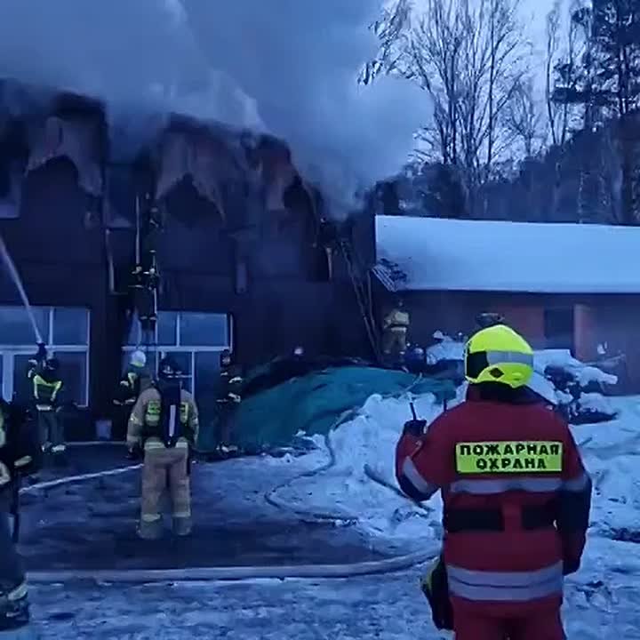 Туристическая база "Юность" загорелась на Алтае. Густой дом поднимается от крыши одного из зданий.