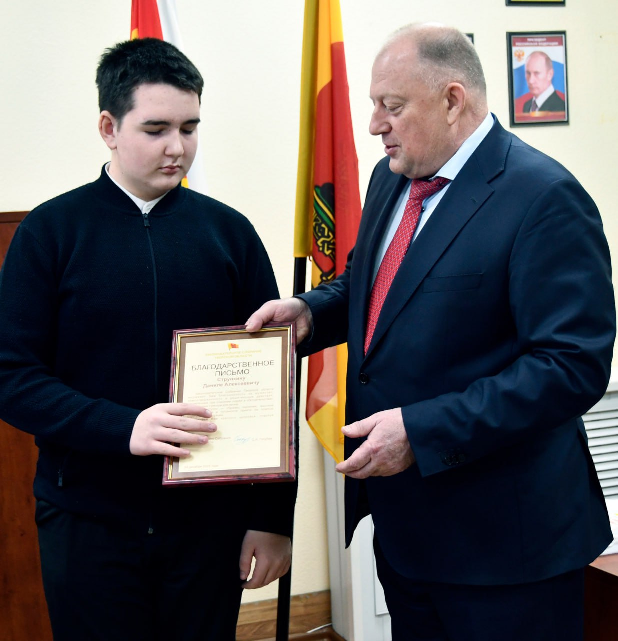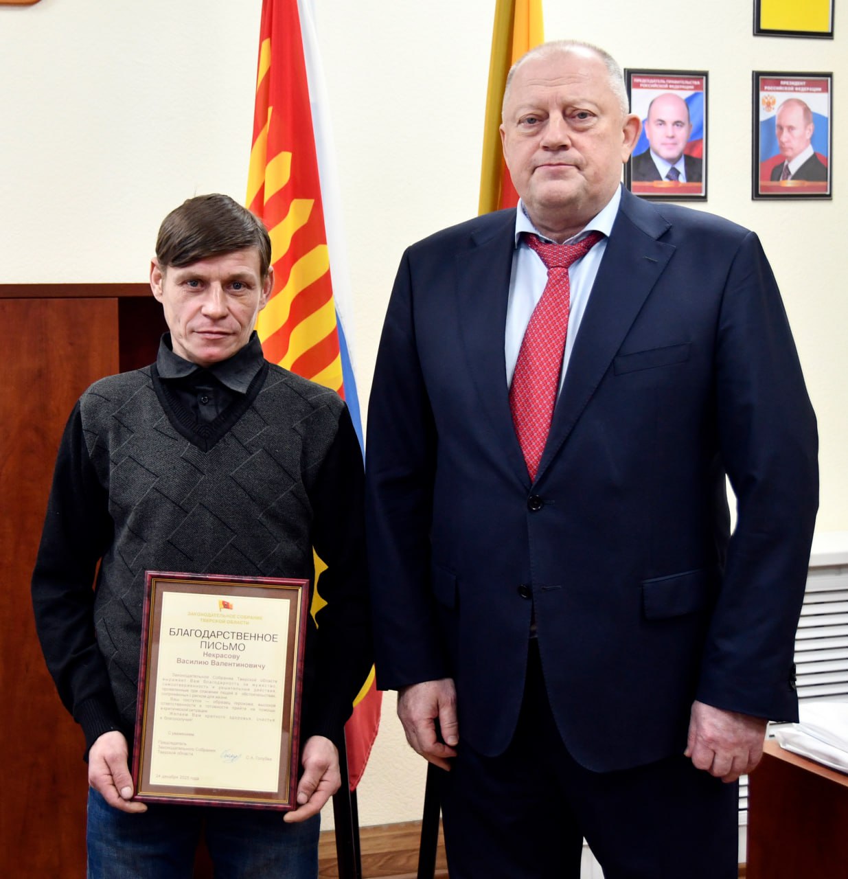 Председатель Заксобрания Сергей Голубев встретился с жителями Зубцовского округа Василием Некрасовым и Данилой Стрункиным, проявившими мужество, самоотверженность и решительные действия при спасении людей.