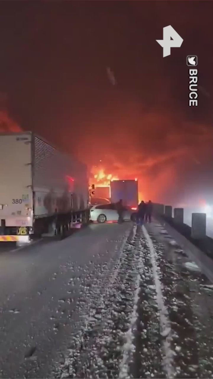 Авария случилась на одной из скоростных магистралей в японской префектуре Гумма. Предварительная причина - гололедица. При столкновении более 10 автомобилей загорелись.