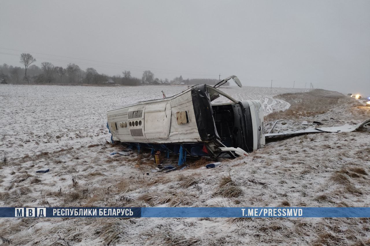 Водитель автобуса, который направлялся со стороны Минска, предварительно, не справился с управлением. Транспорт съехал в кювет и перевернулся, сообщает белорусский МВД.