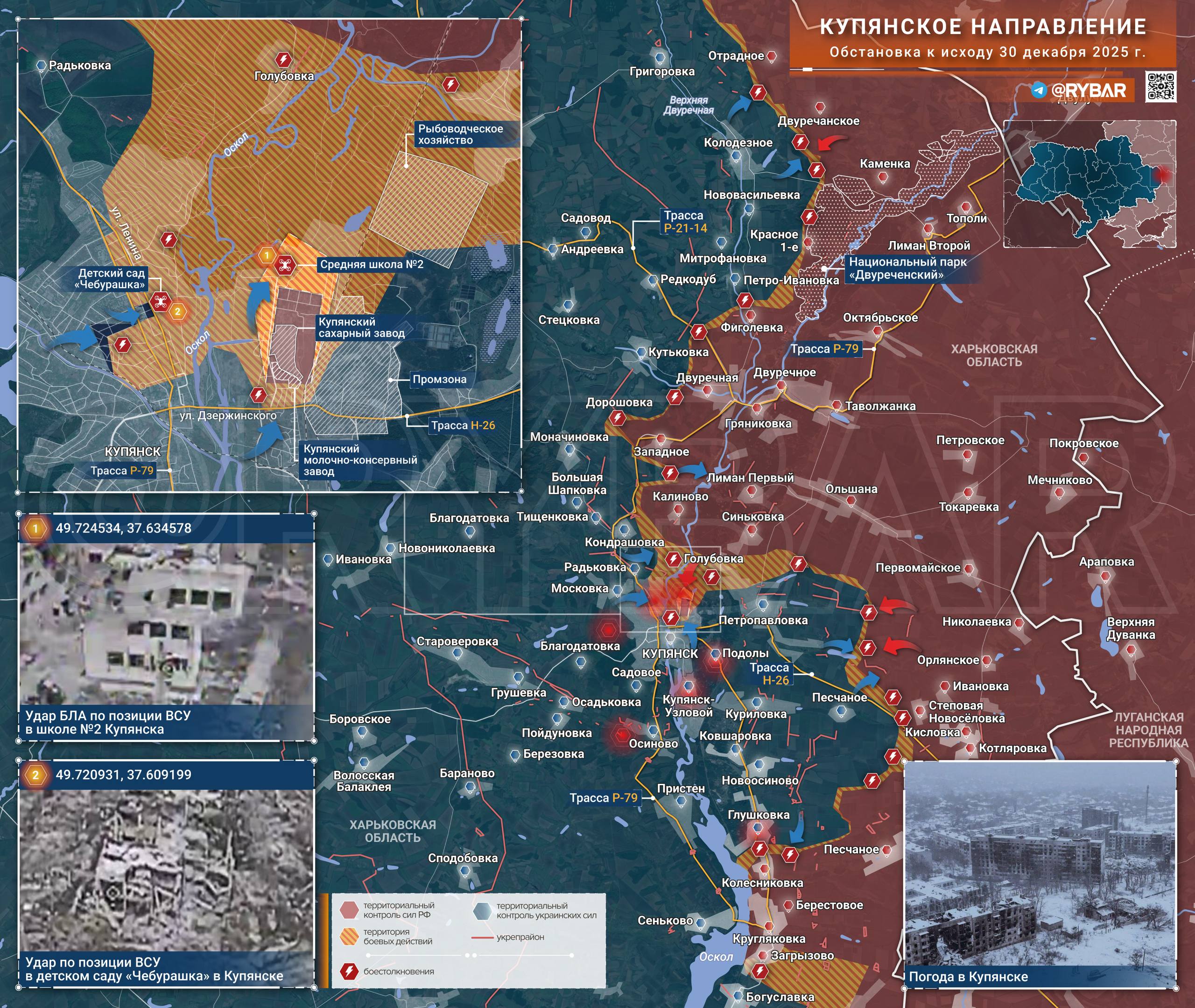Украинские формирования расширили зону контроля в центре Купянска, а также прорвались на северные окраины города. Российские операторы БЛА поражают пехоту ВСУ, но их возможности снижены из-за непогоды.
